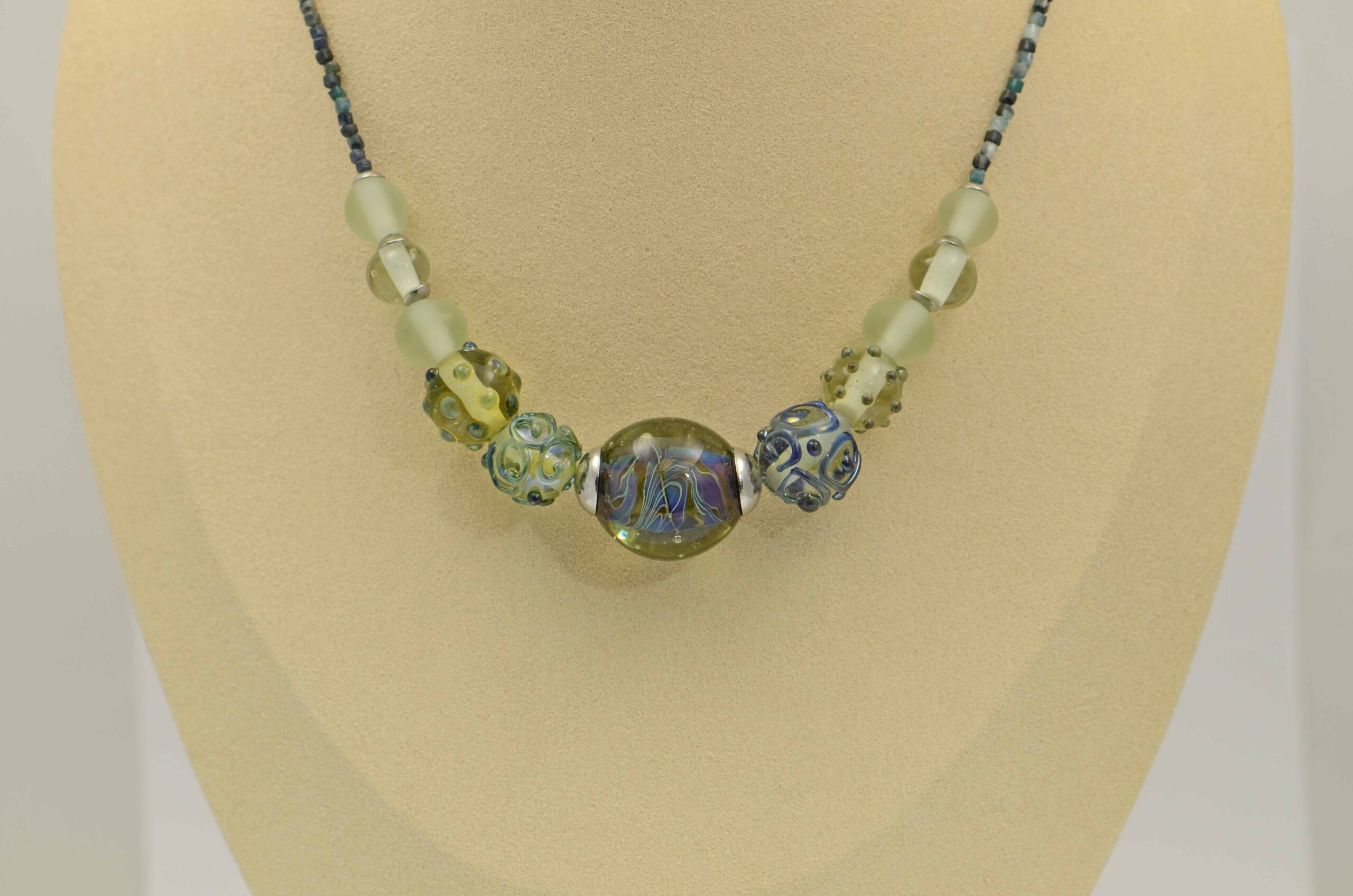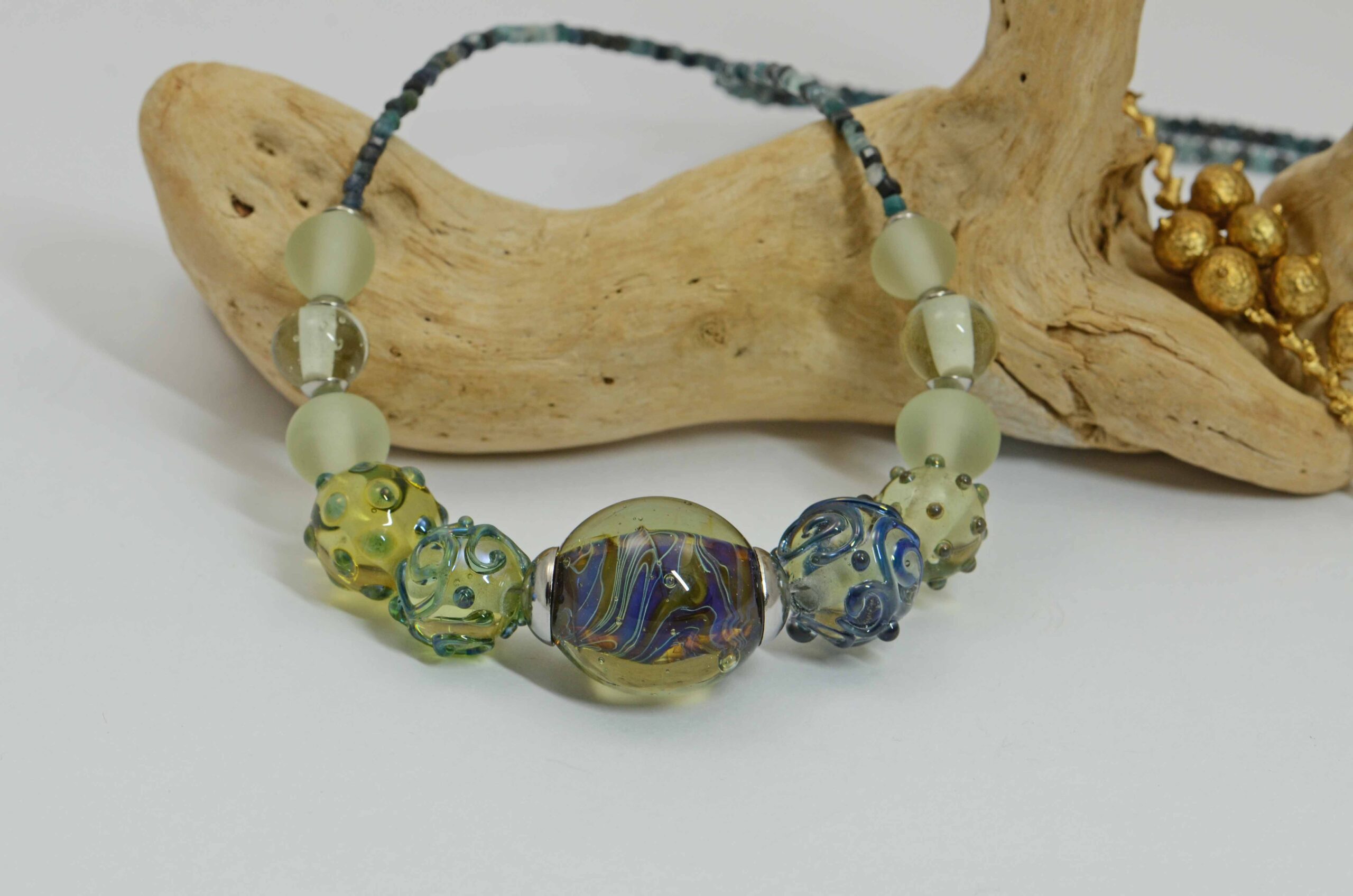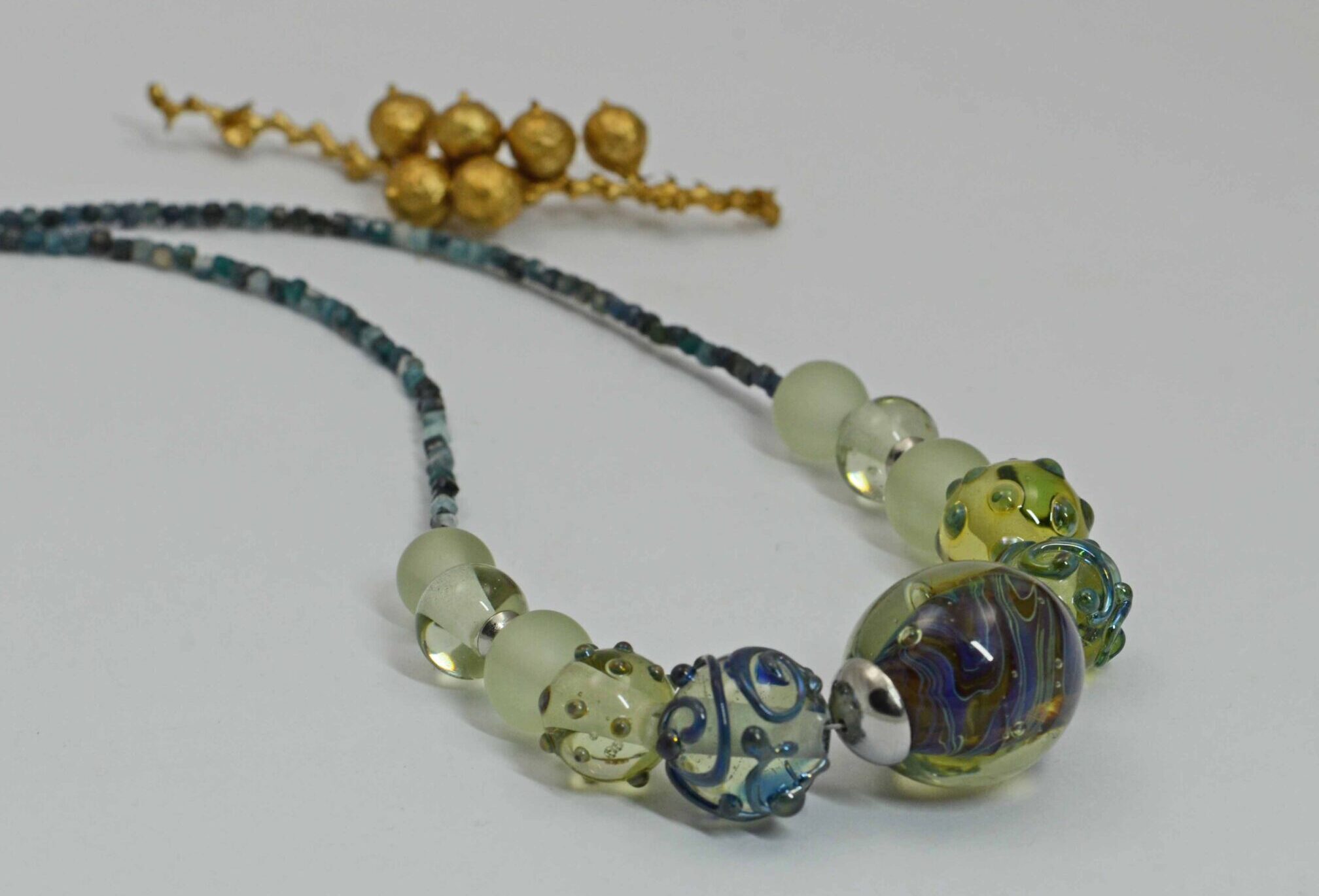 Náhrdelník s pěti vinutkami doplněnými jednobarevnými lesklými/matovanými vinutkami, komponenty z chirurgické oceli a drobnými kostičkami modrého turmalínu.