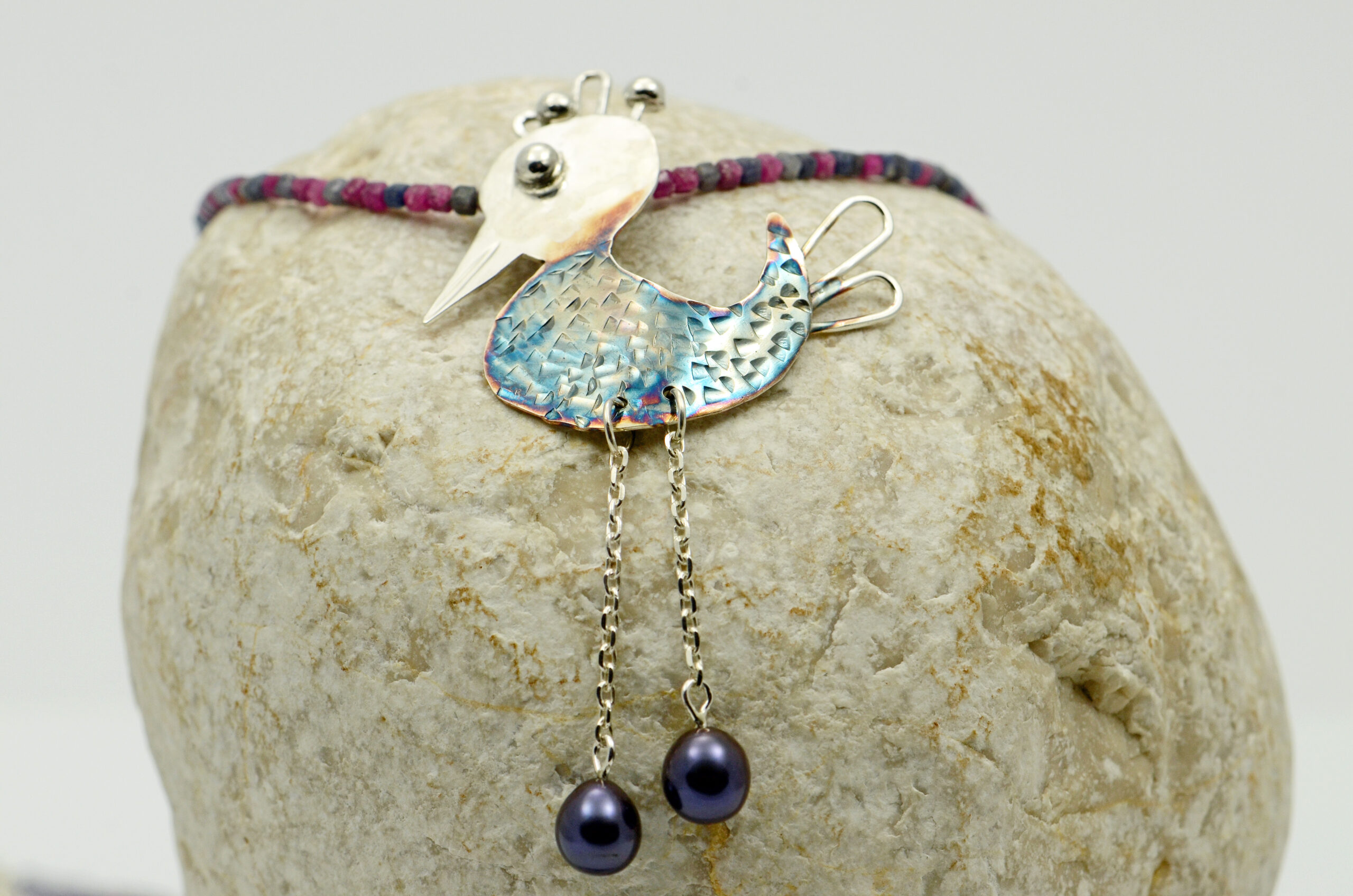 Ptáček má pařátky z říčních perel a tepané a patinované bříško, takže krásně barevně ladí se závěsem z minerálů.