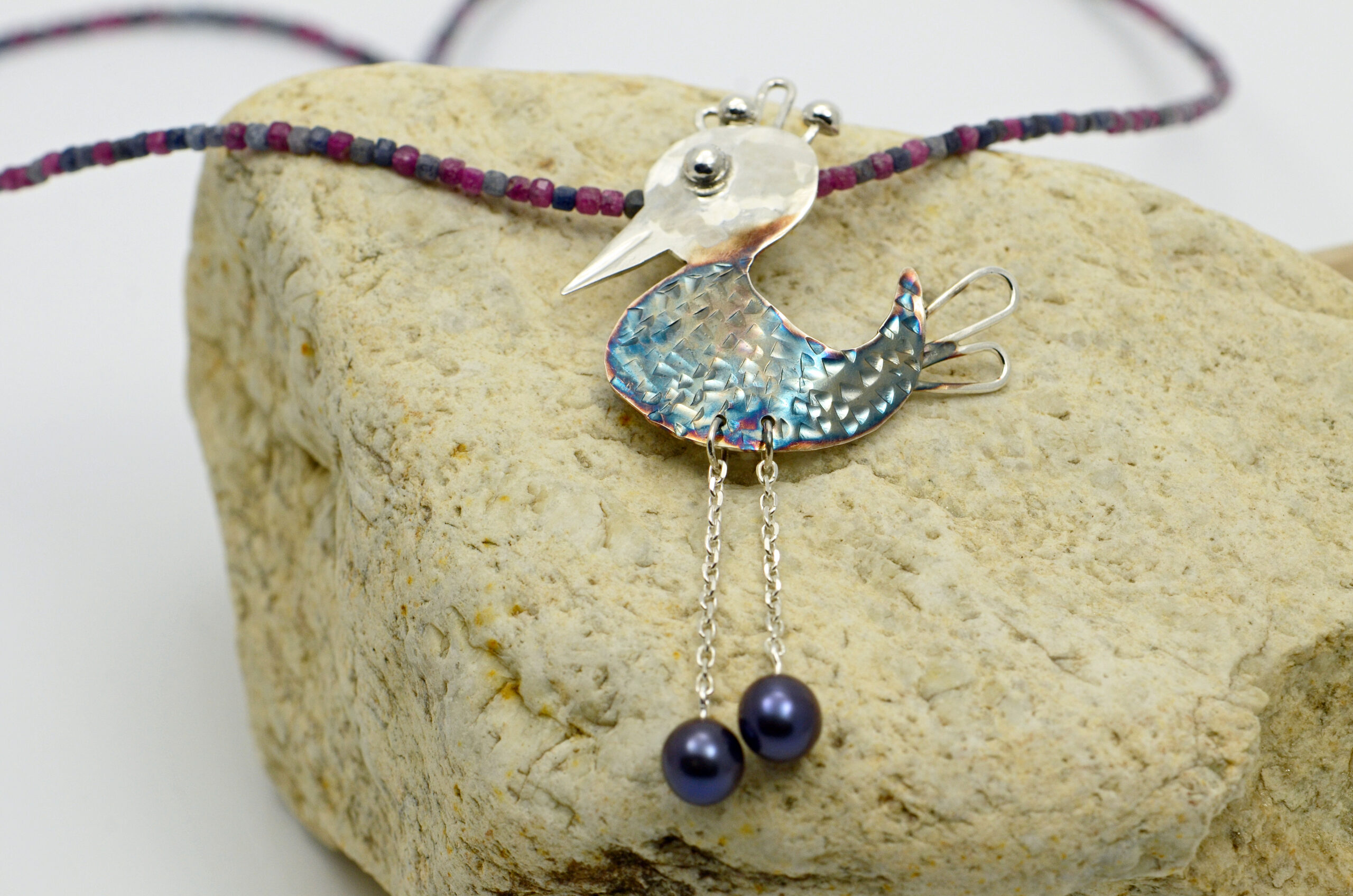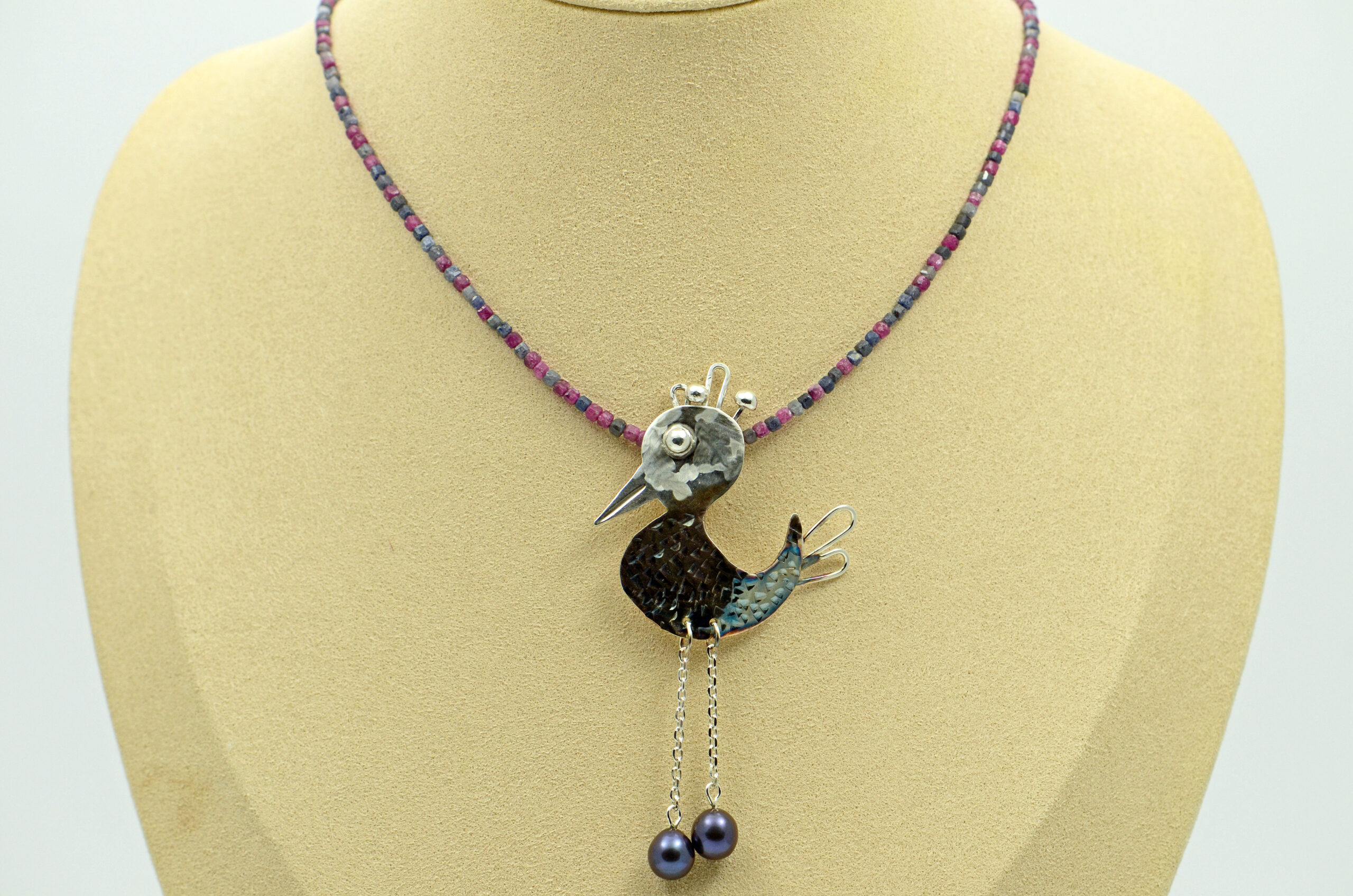 Autorský šperk s veselým ptáčkem na návleku z drobných neleštěných rubínů a safírů.