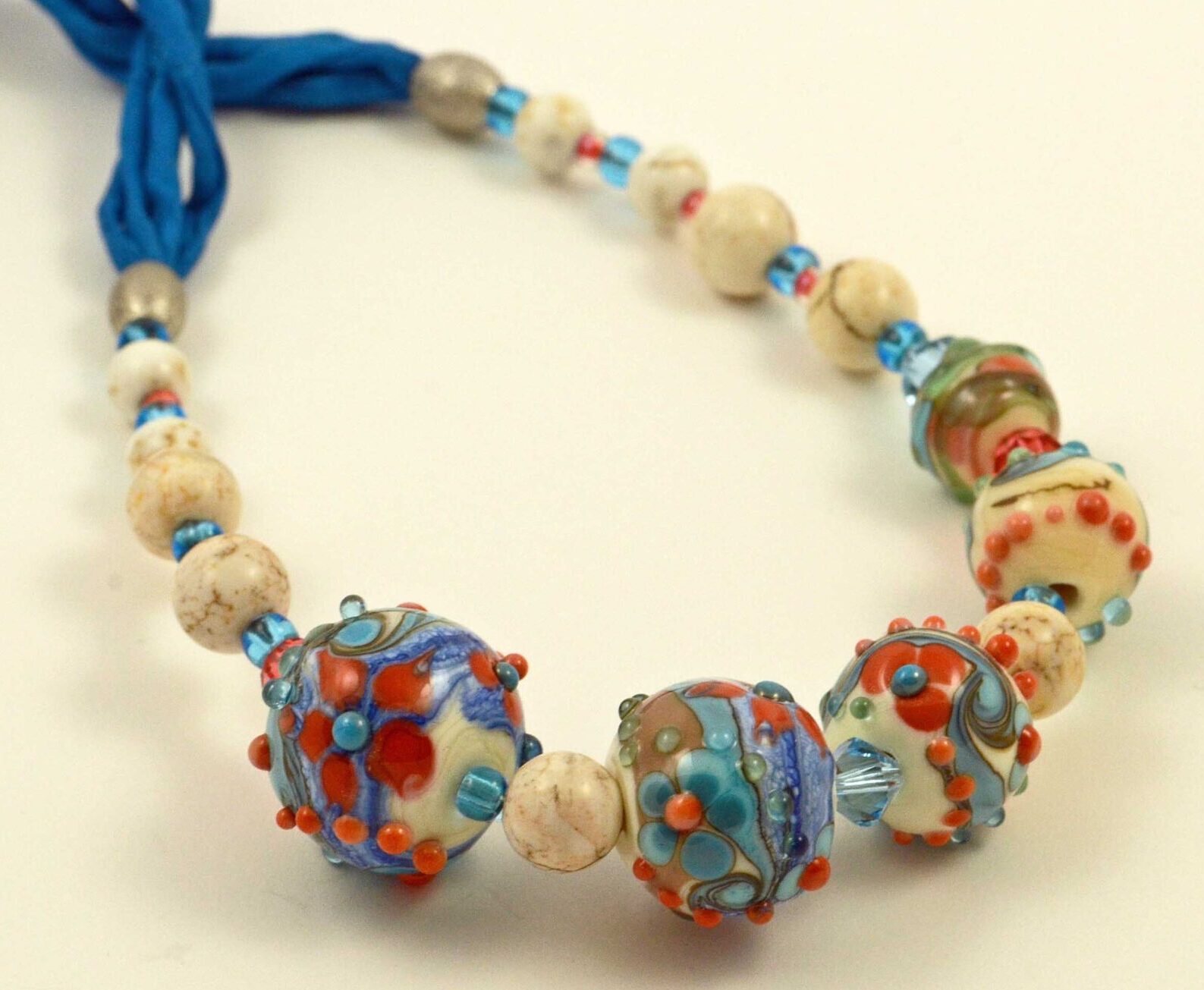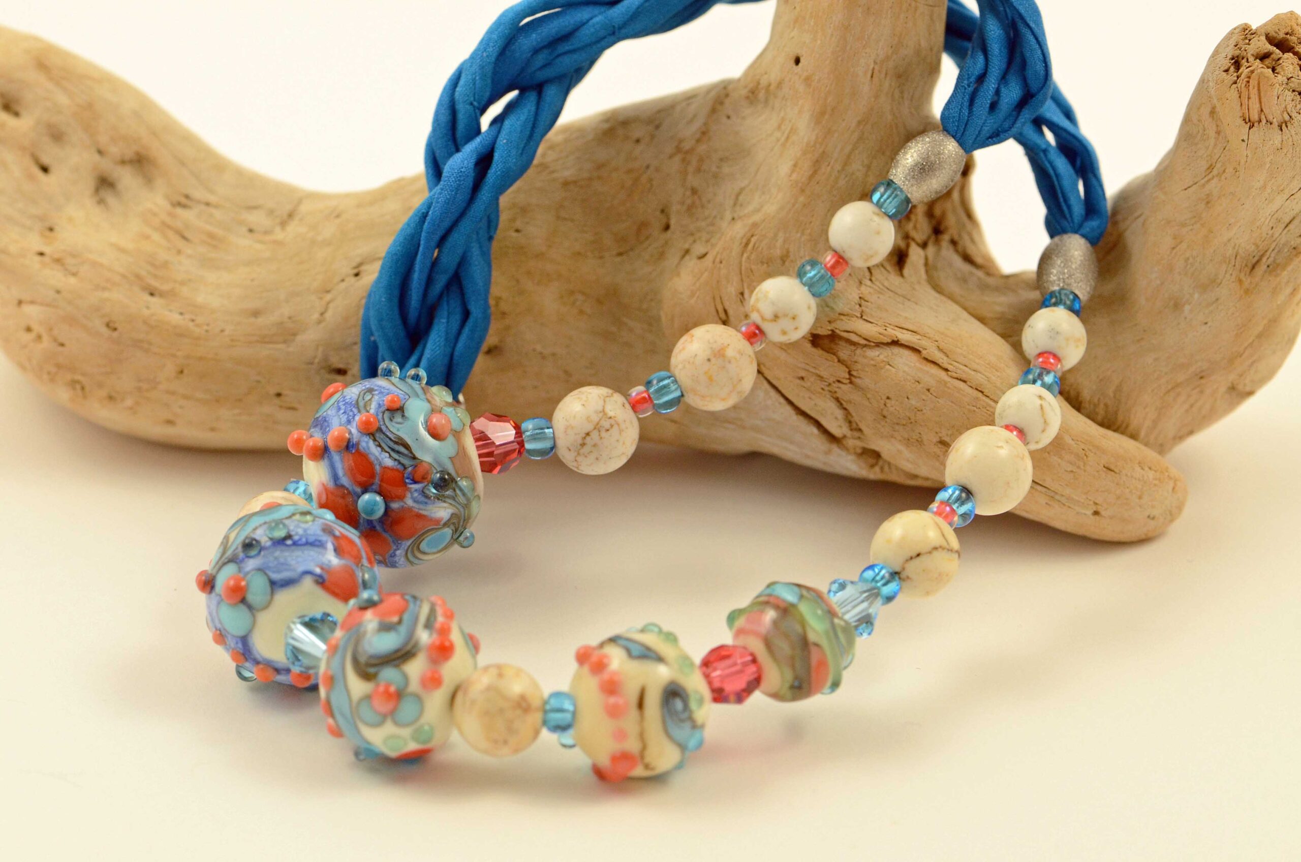 Náhrdelník s pěti ručně vinutými korálky asymetricky od největší po nejmenší doplněnými howlitem, korálky Swarovski ve stejných barvách a komponenty z chirurgické oceli na čtyřnásobné hedvábné šňůrce.