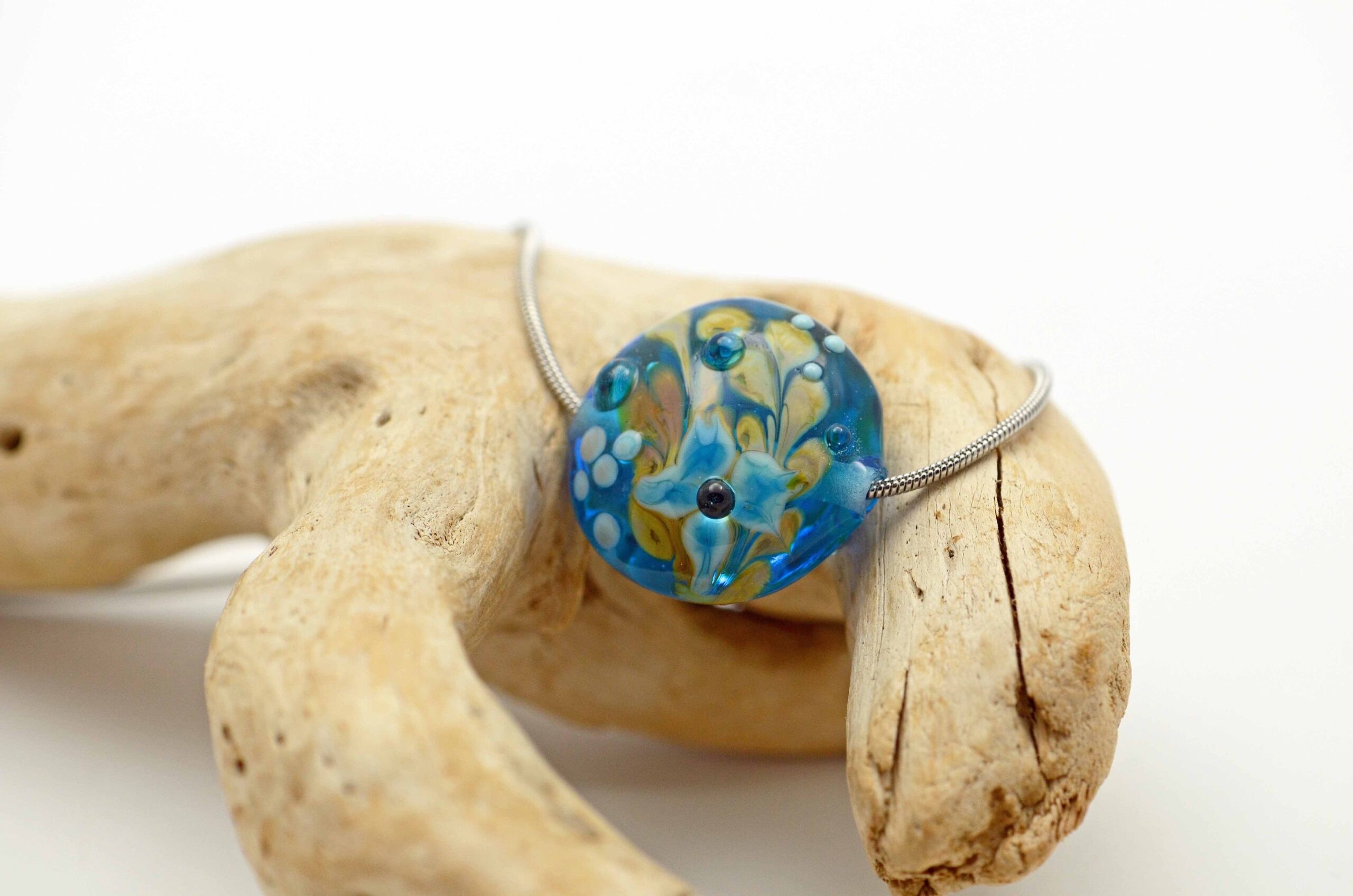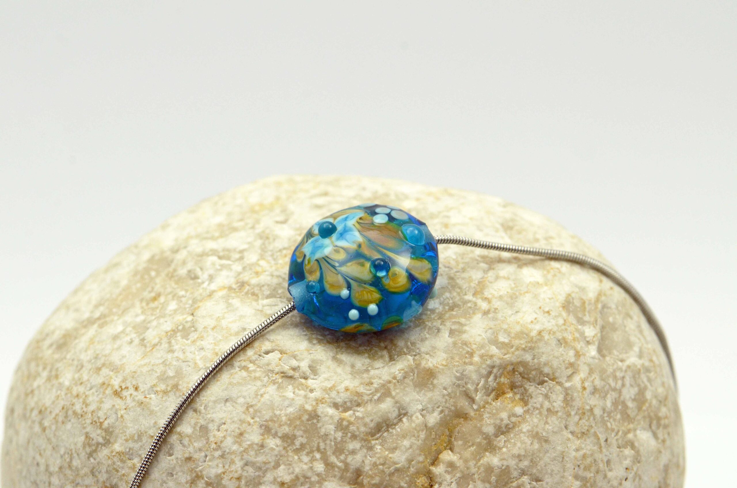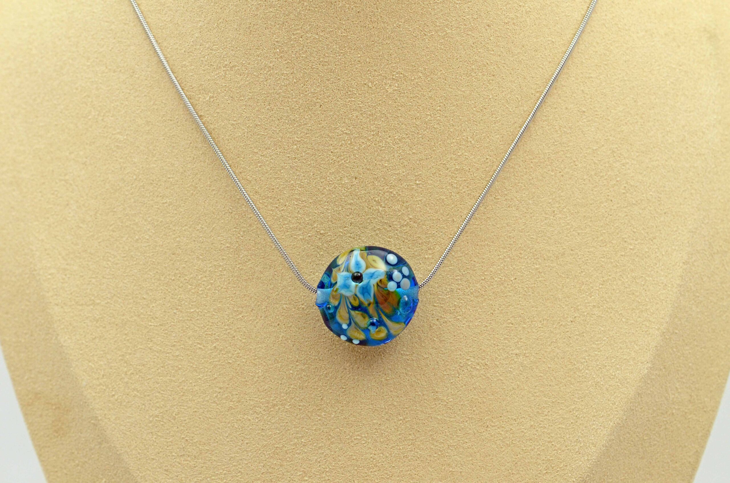 Náhrdelník s ručně vinutým korálkem ve tvaru čočky na řetízku z chirurgické oceli.