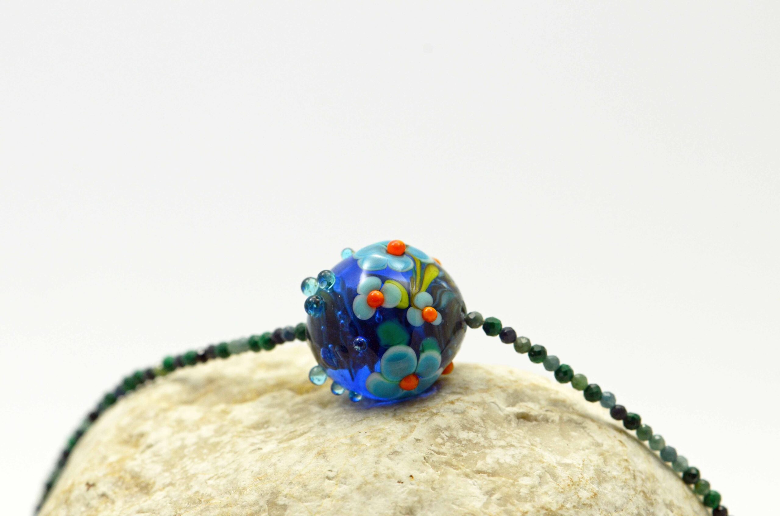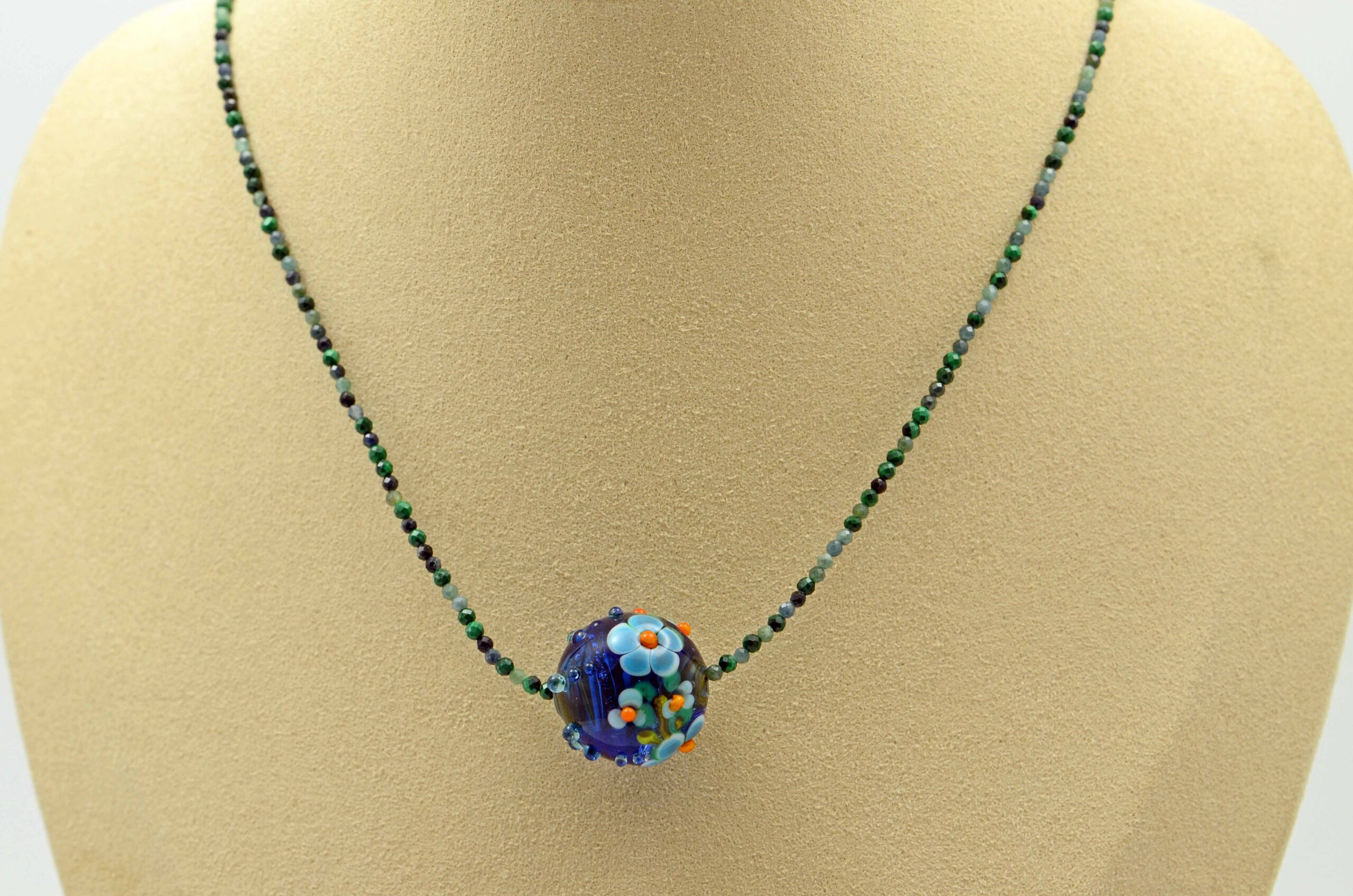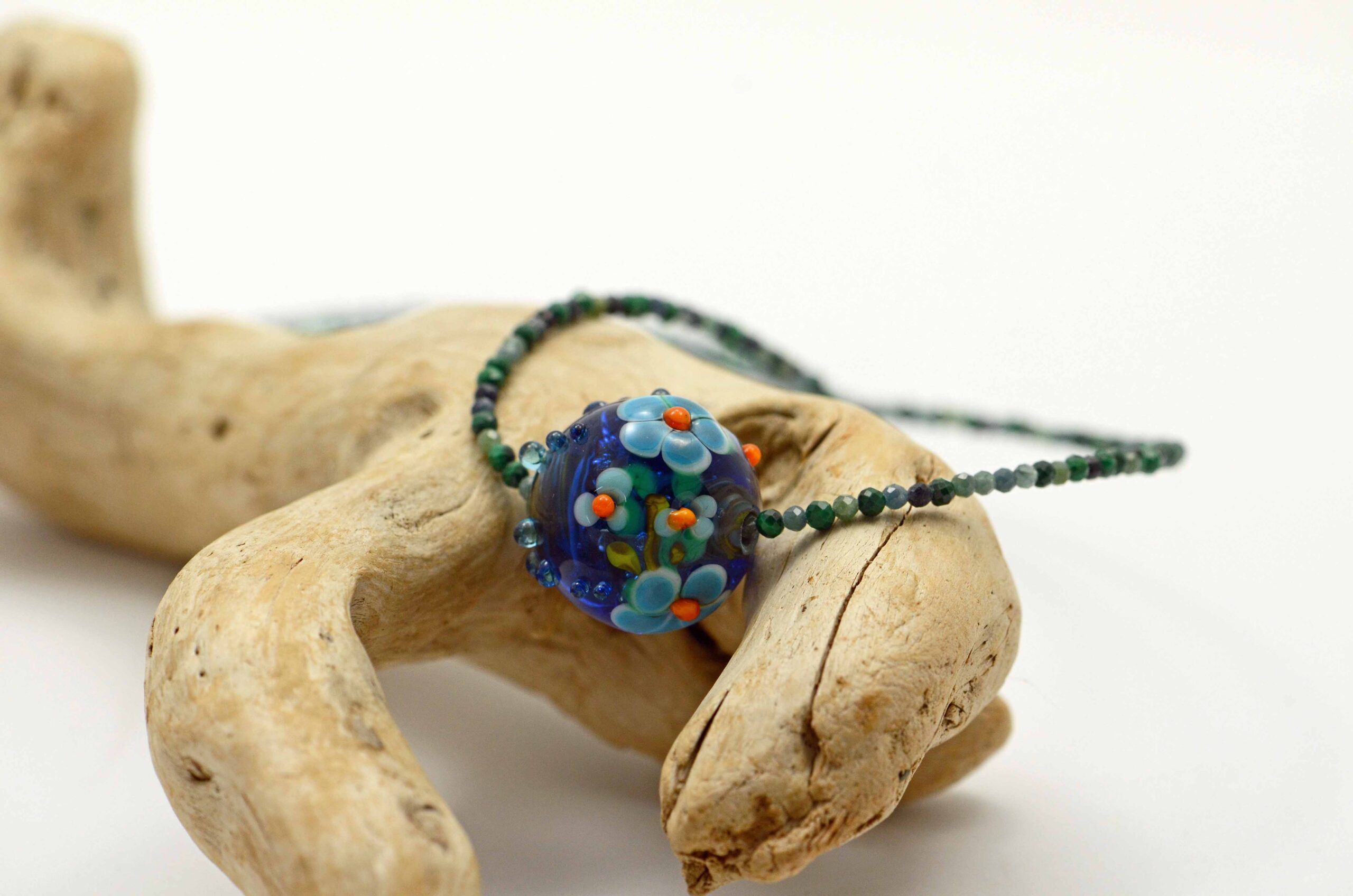 Náhrdelník s ručně vinutým korálkem zdobeným květinovým vzorem na návleku s drobných broušených malachitů a tmavomodrých turmalínů.