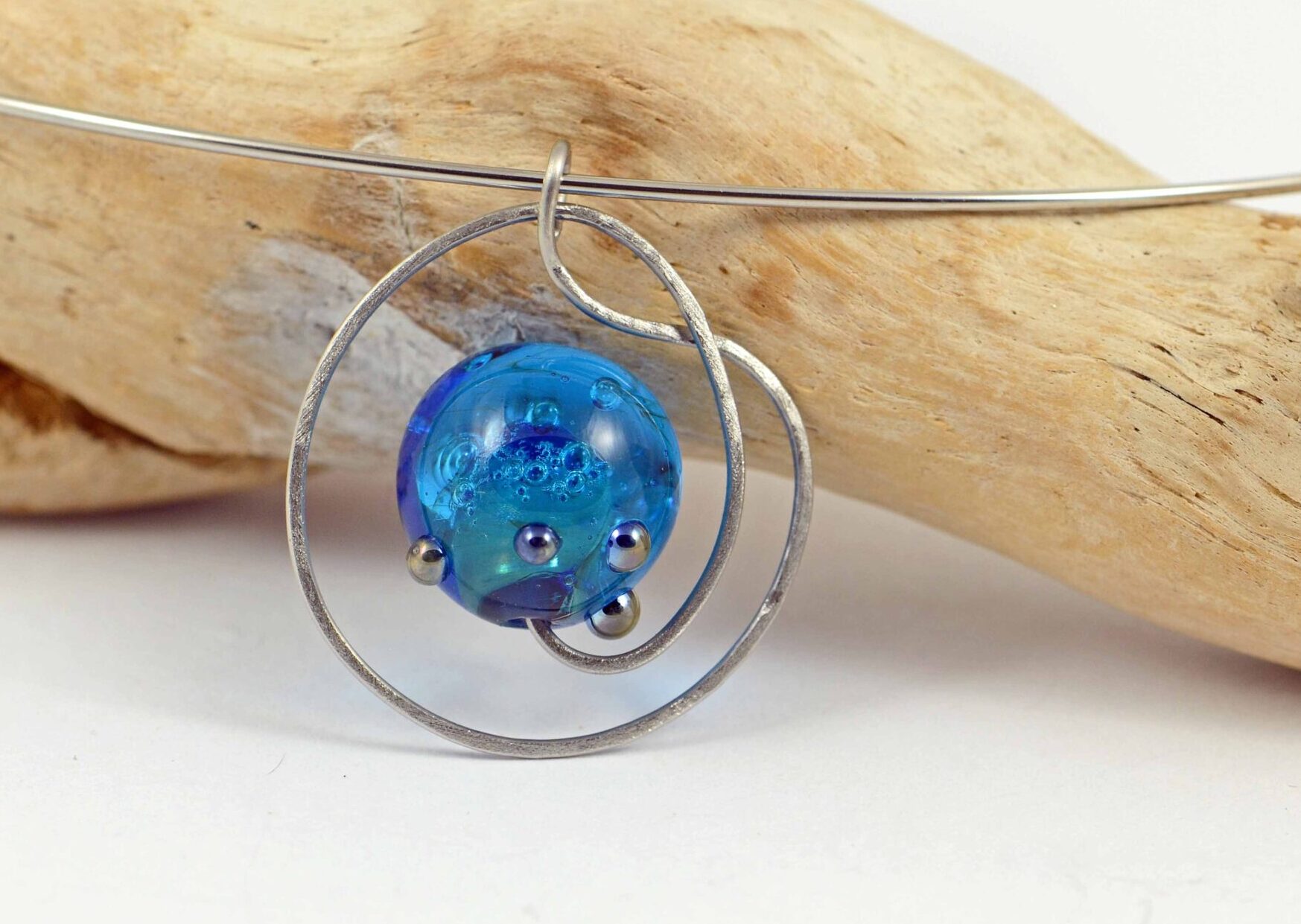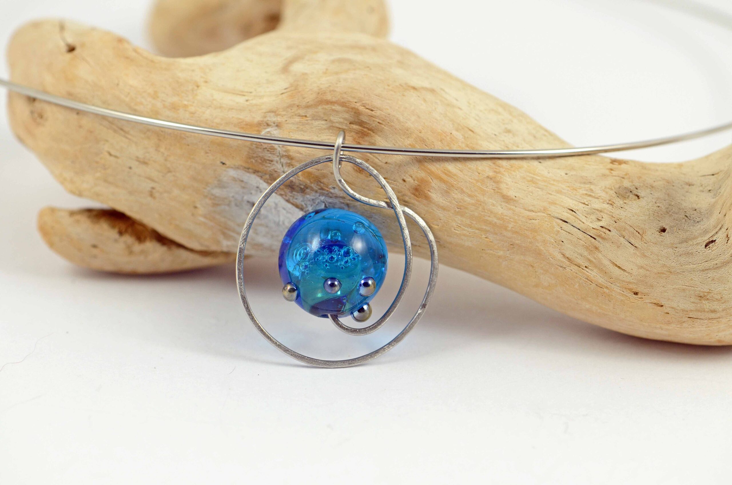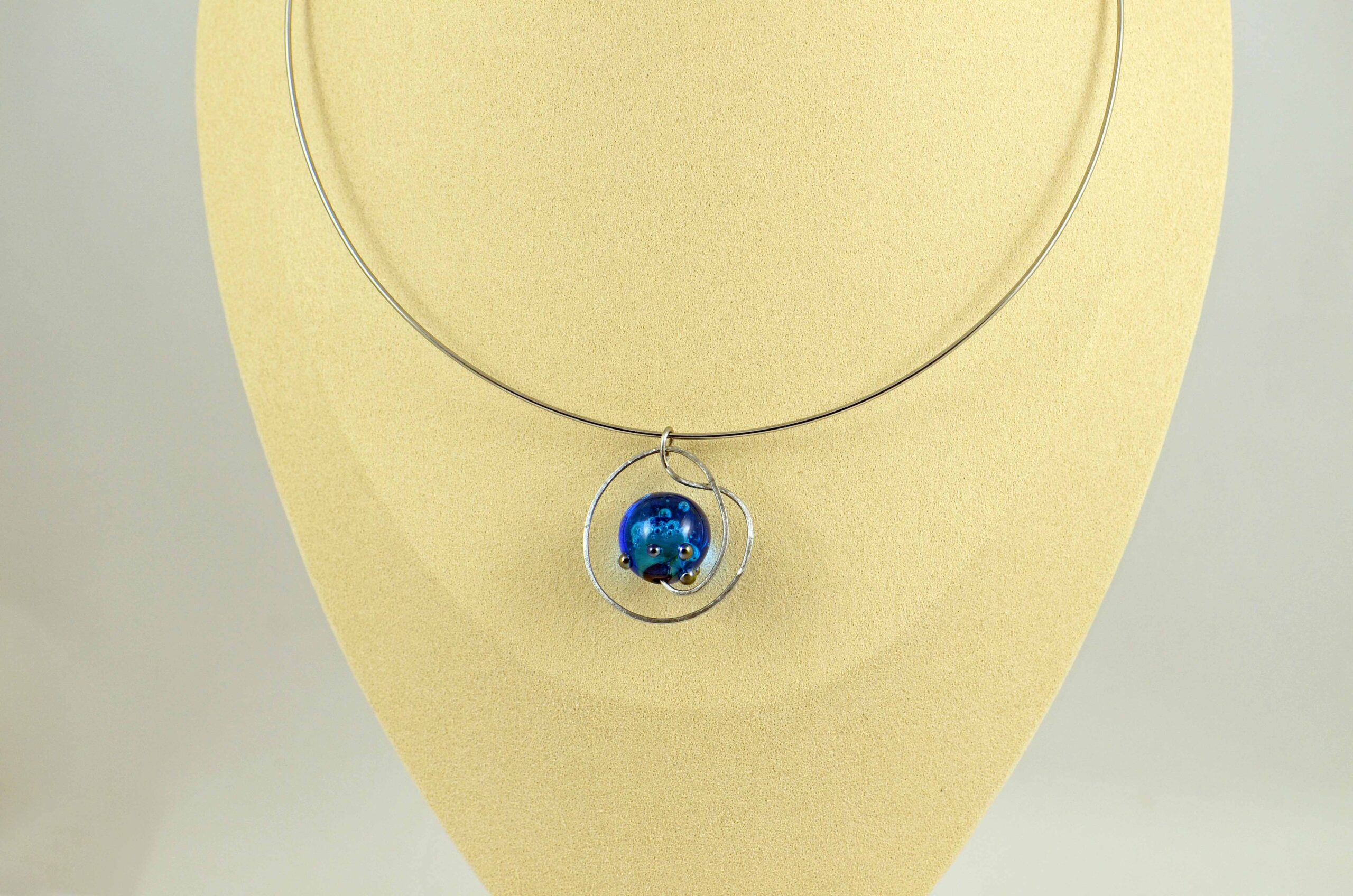 Náhrdelník s ručně vinutým korálkem, který je zasazený do tepaného a matovaného přívěsku zavěšeného na obruči.