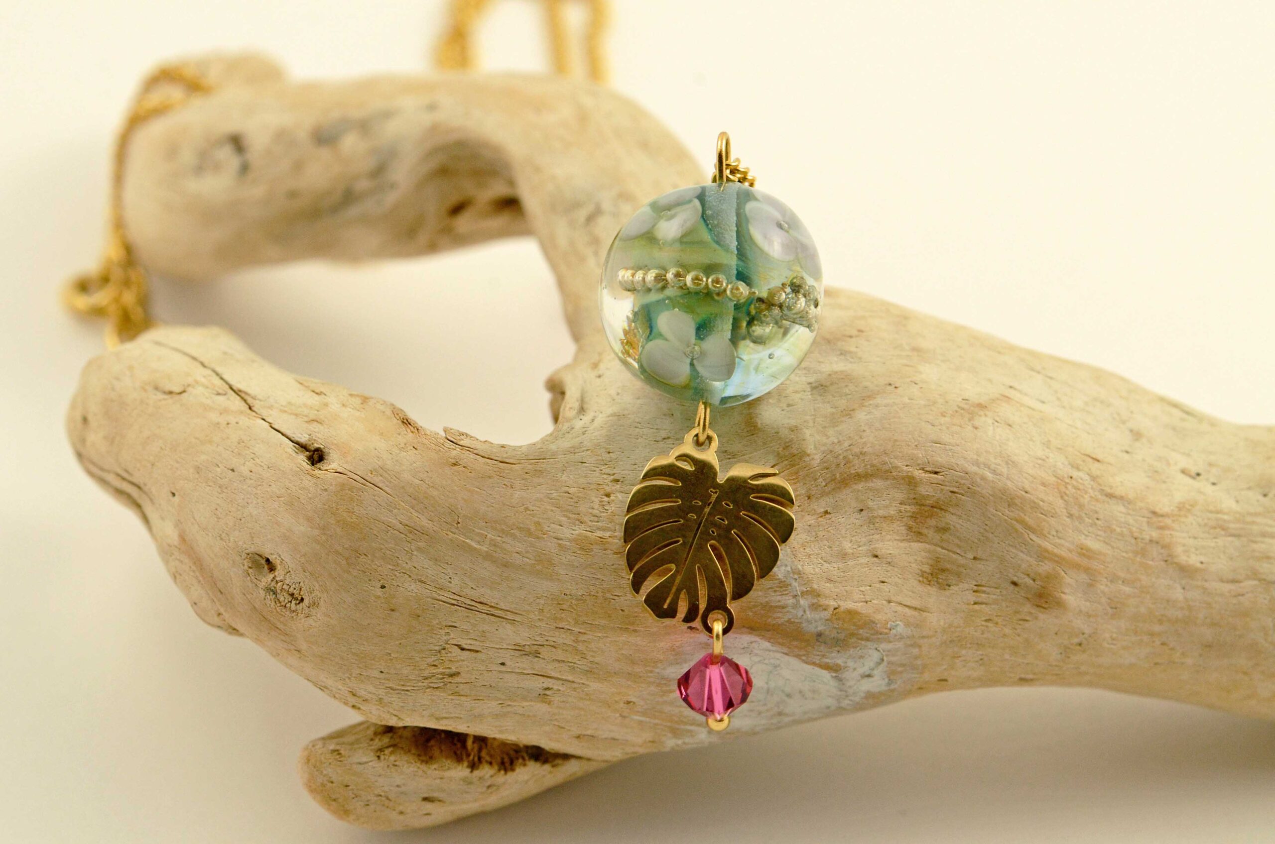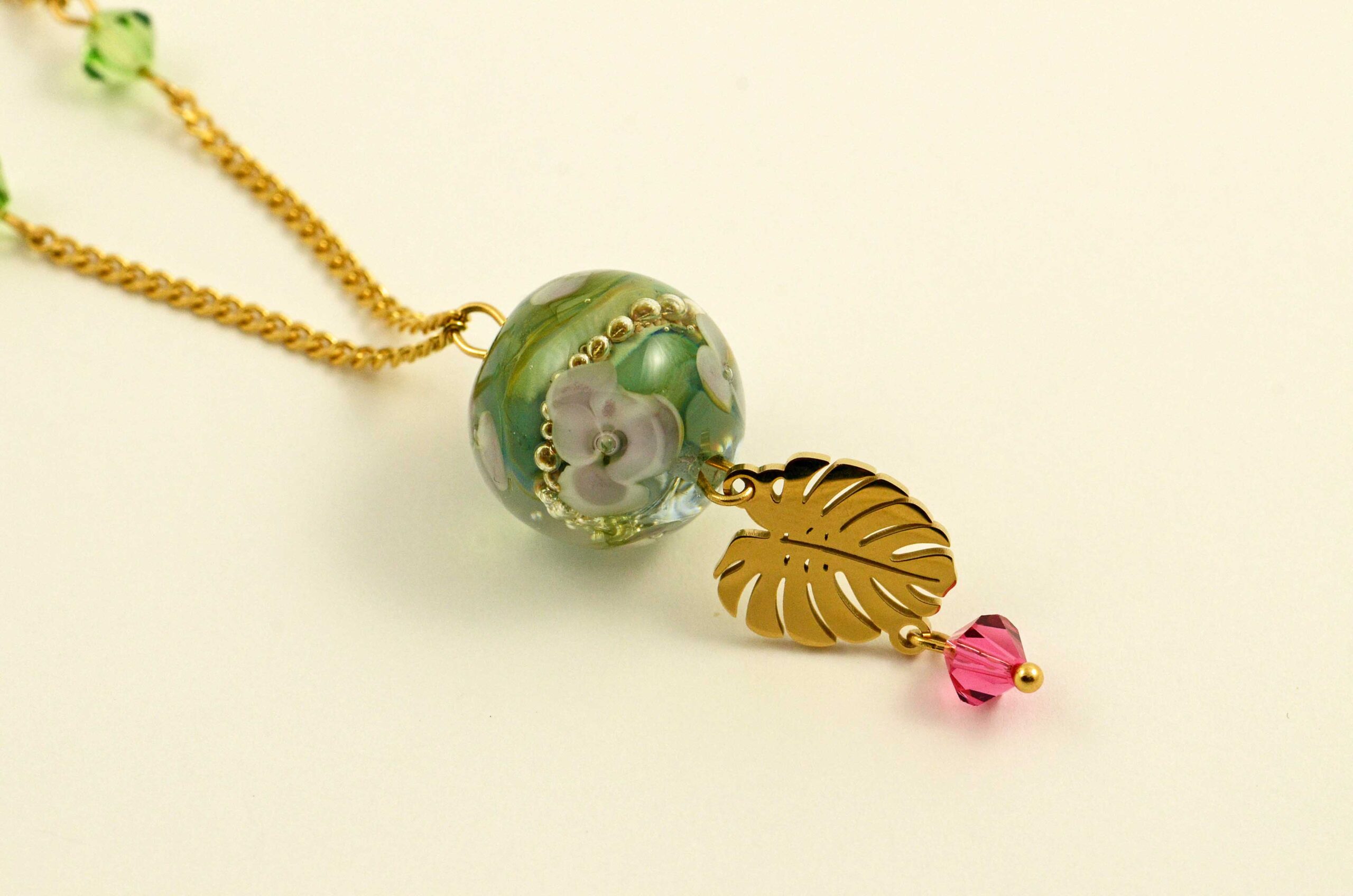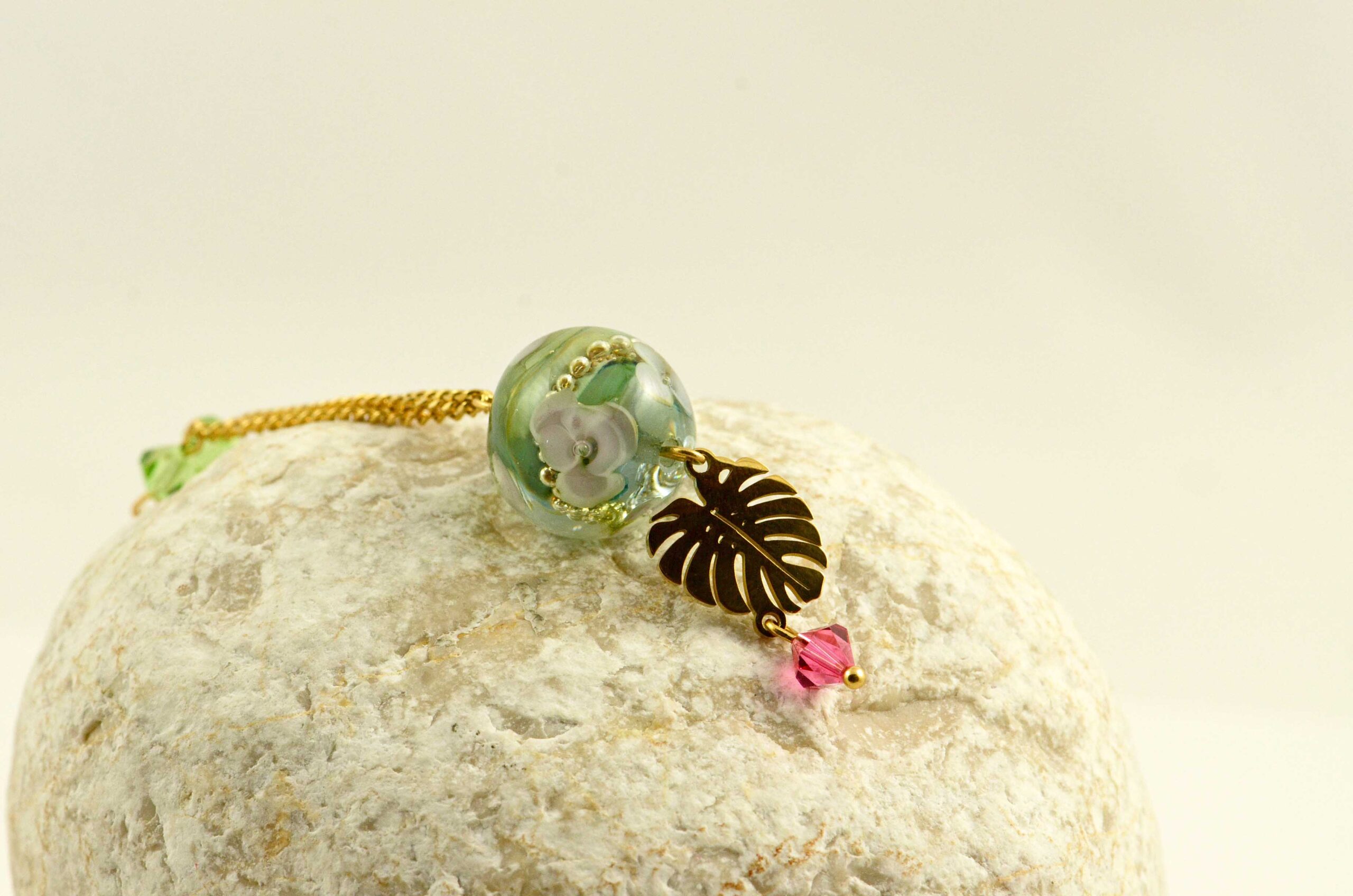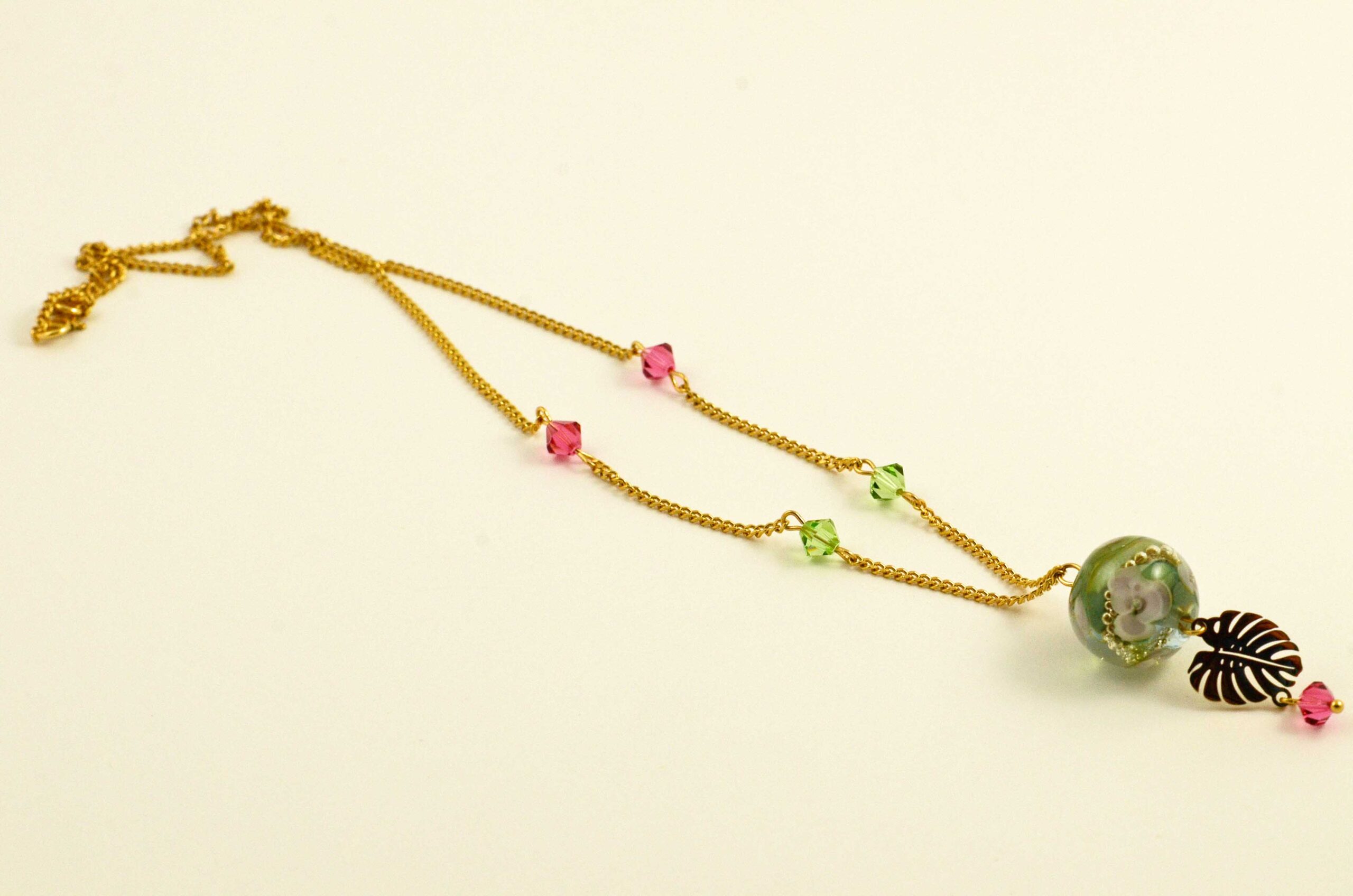 Náhrdelníku dominuje ručně vinutá kulička zdobená květinami a bublinkami doplněná korálky Swarovski a komponenty z chirurgické oceli s galvanizací zlaté barvy, řetízek je ze stejného materiálu a zapíná se kroužkovou karabinkou.