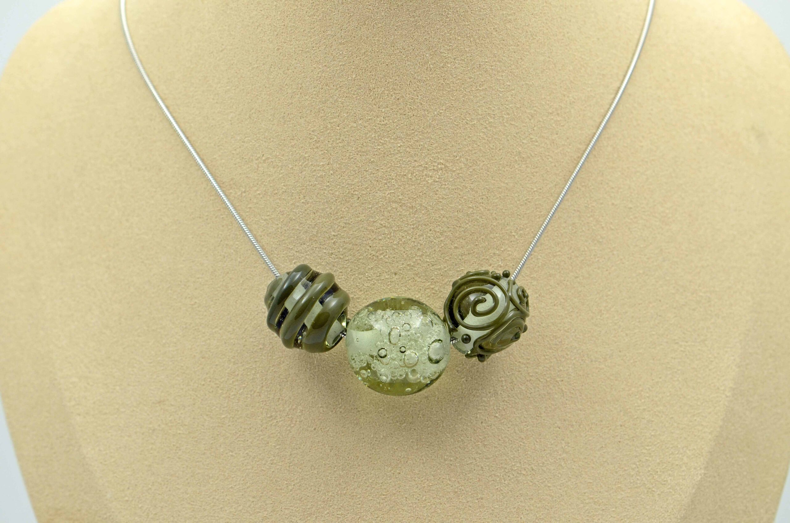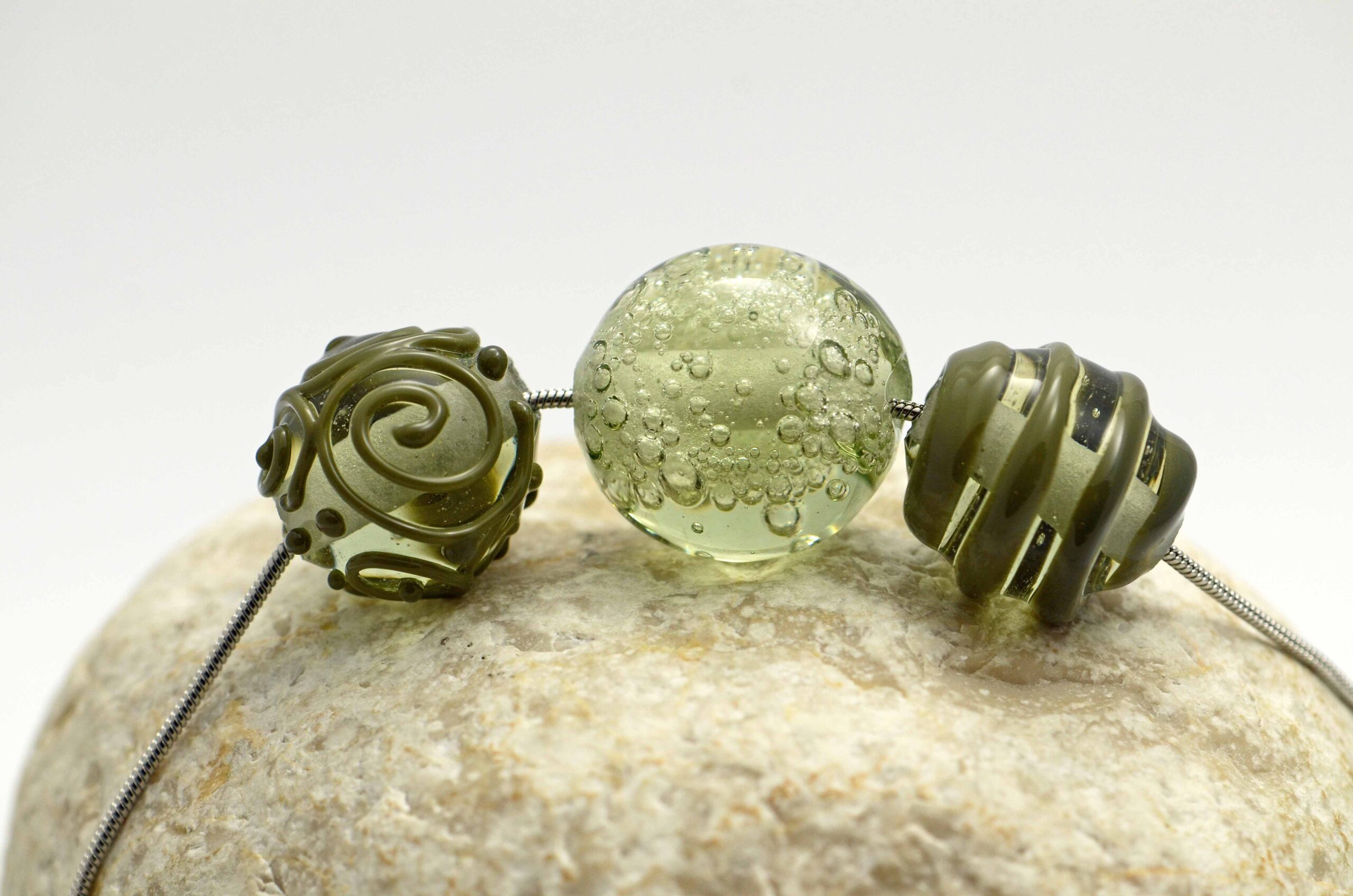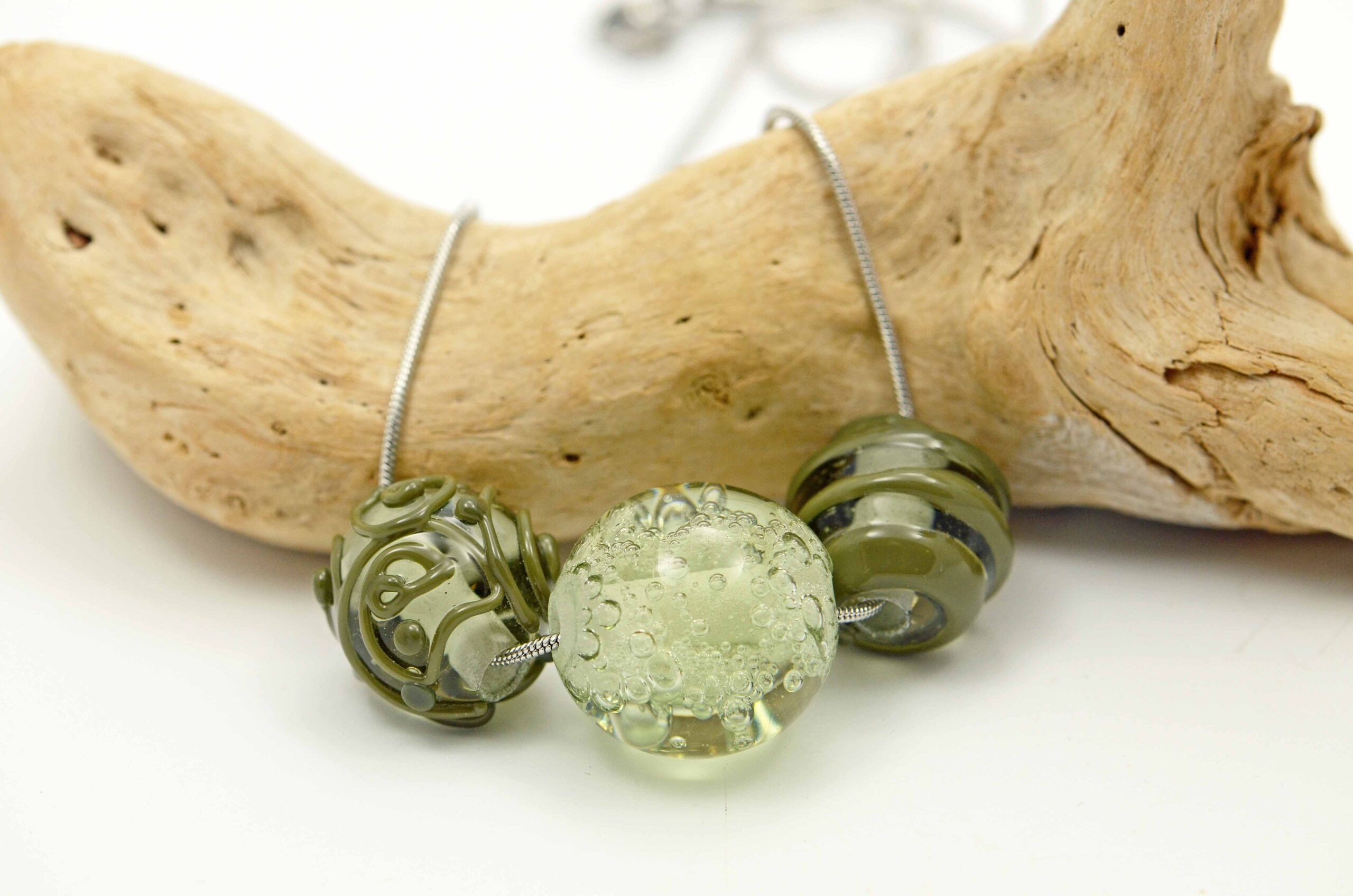 Vinutky jsou z tzv. „lesního skla“ zn. Lauscha, které znáte z replik např. historických pohárů. Toto sklo není zrovna „parťák v kolektivu oblíbený“, kombinací z ostatními skly spíš ztrácí na kráse, nejvíc vynikne jako solitér, minimalismus mu sluší. V tomto náhrdelníku je zkombinované se sklem barvy olivové od stejného výrobce a tato kombinace mu sedí.