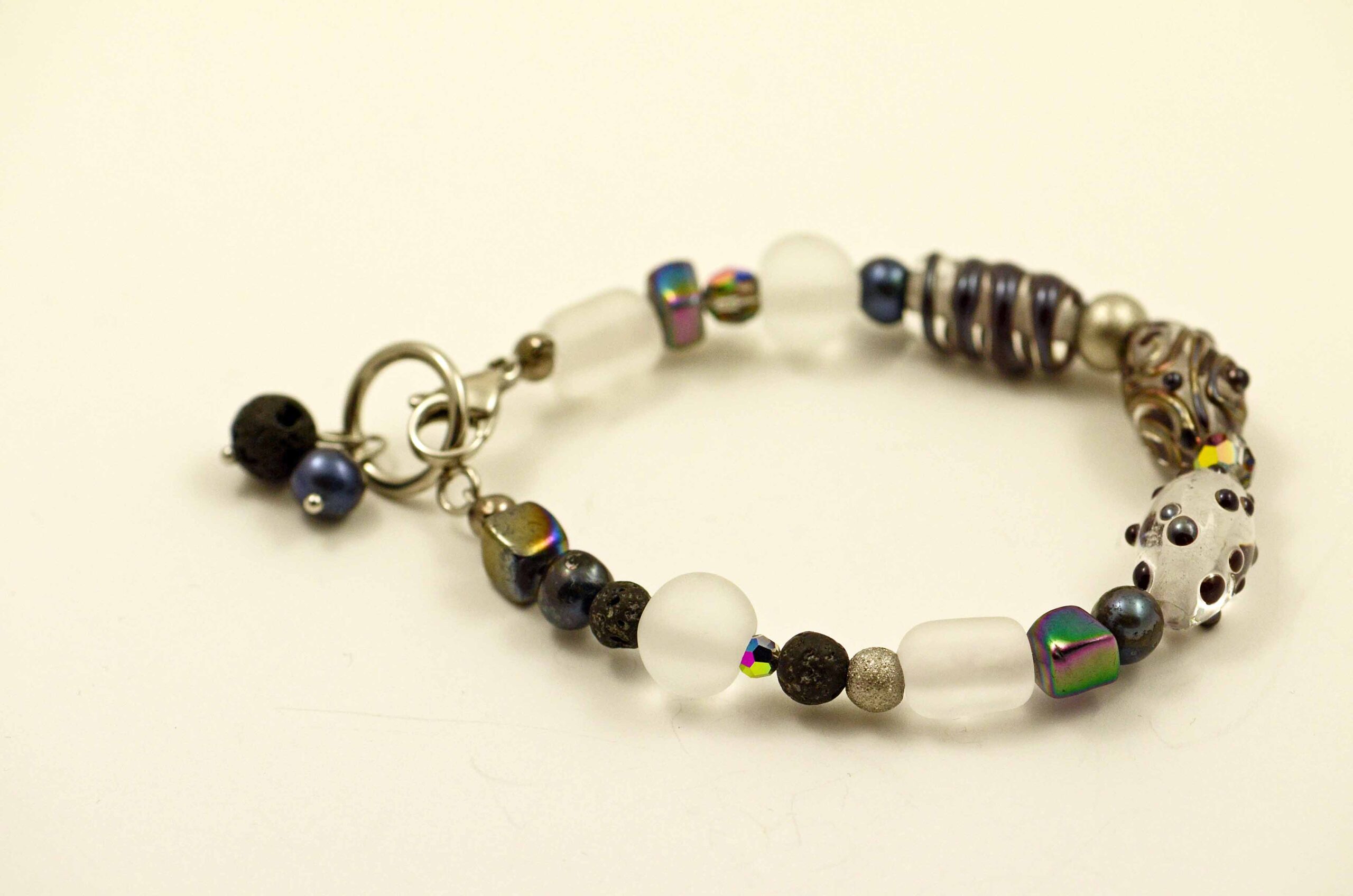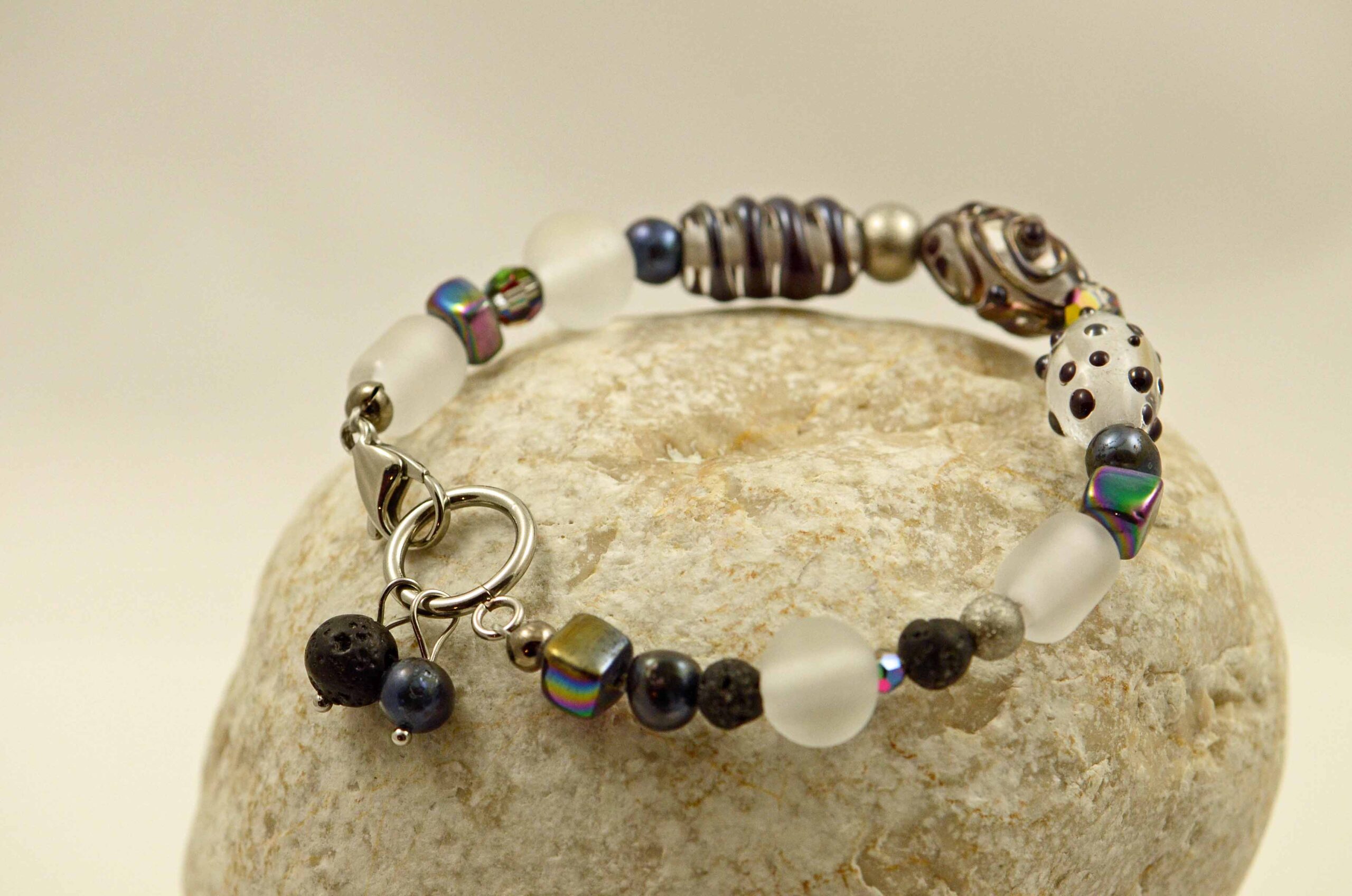 Náramek se sedmi ručně vinutými korálky doplněnými korálky z perleti, chirurgické oceli, korálky Swarovski, lávou a říčními perlami.