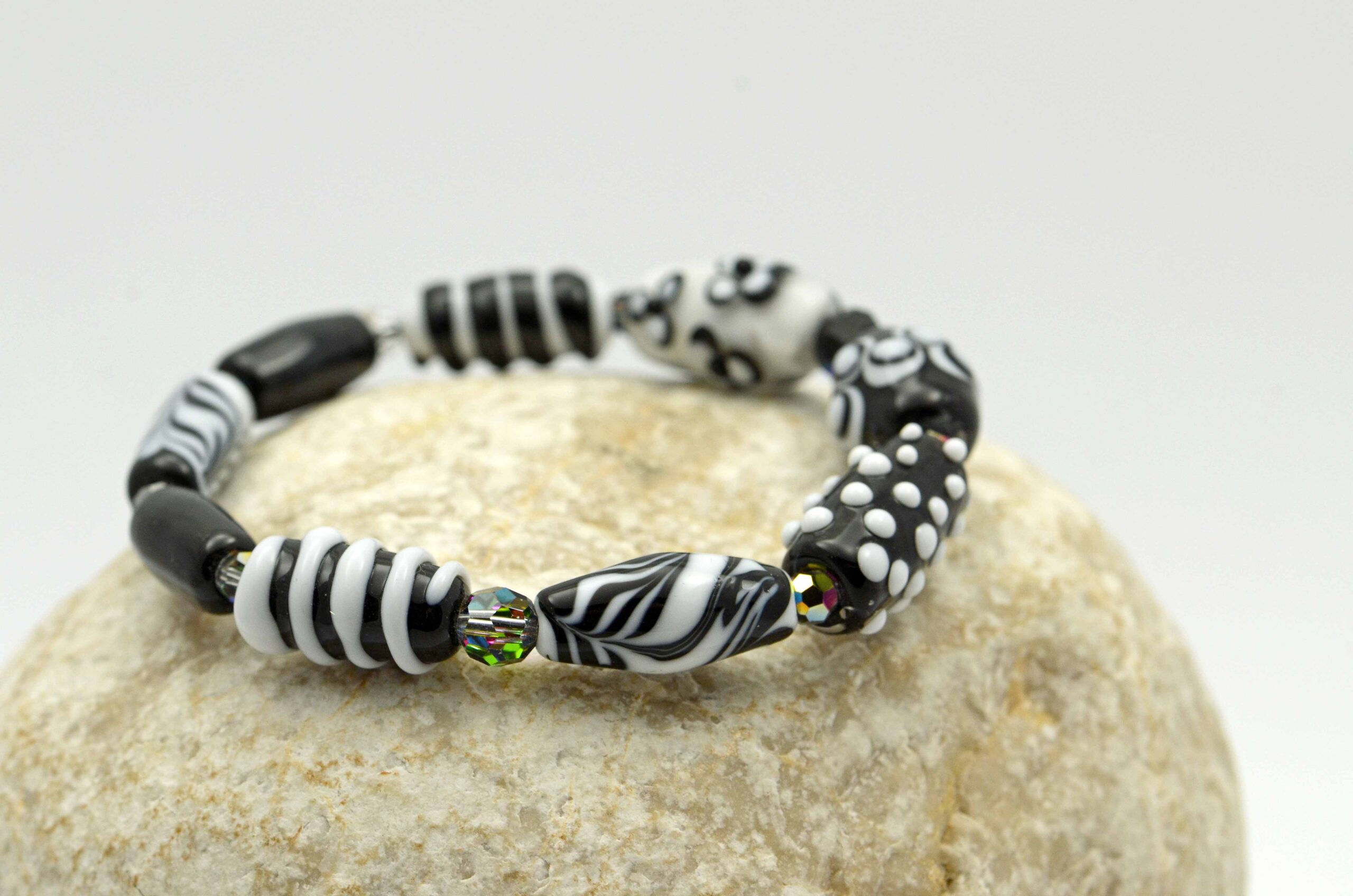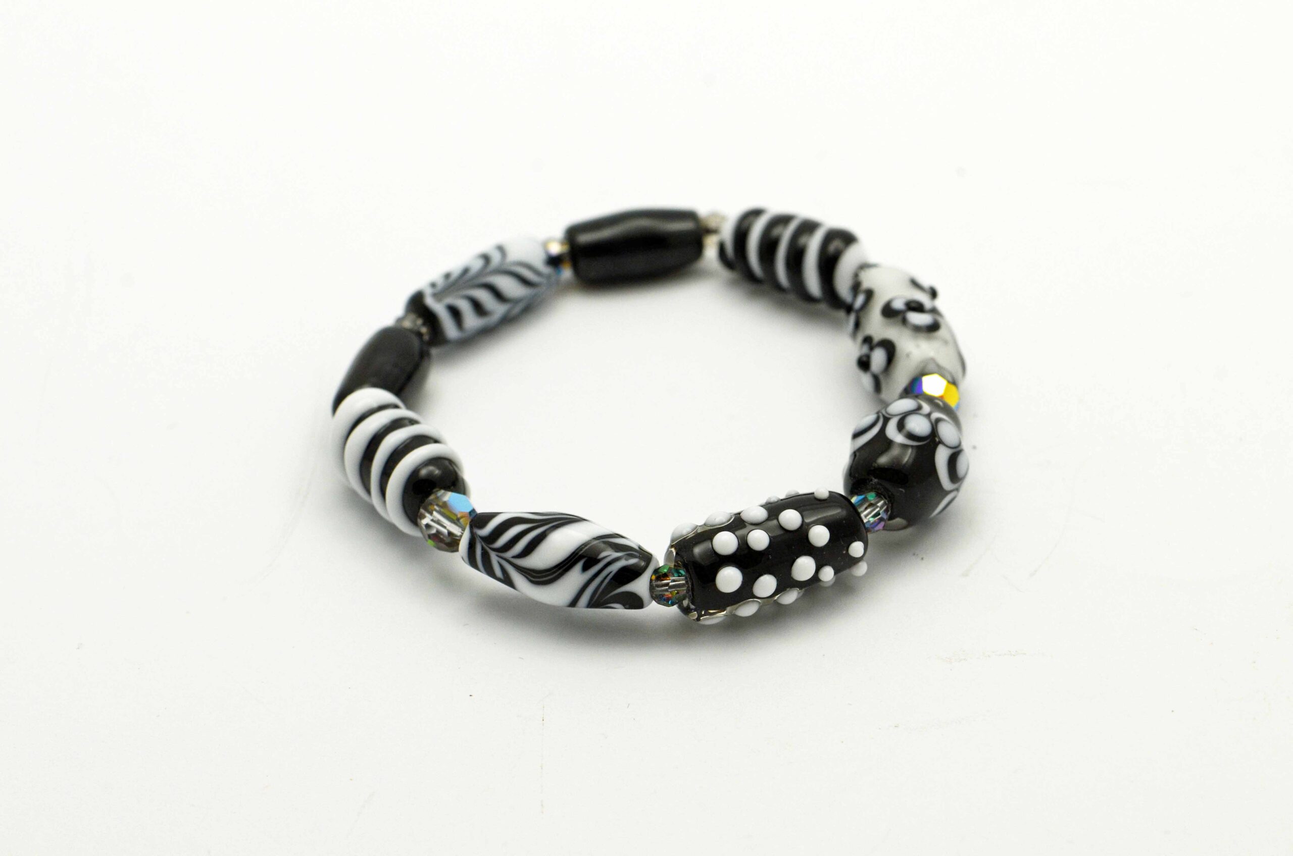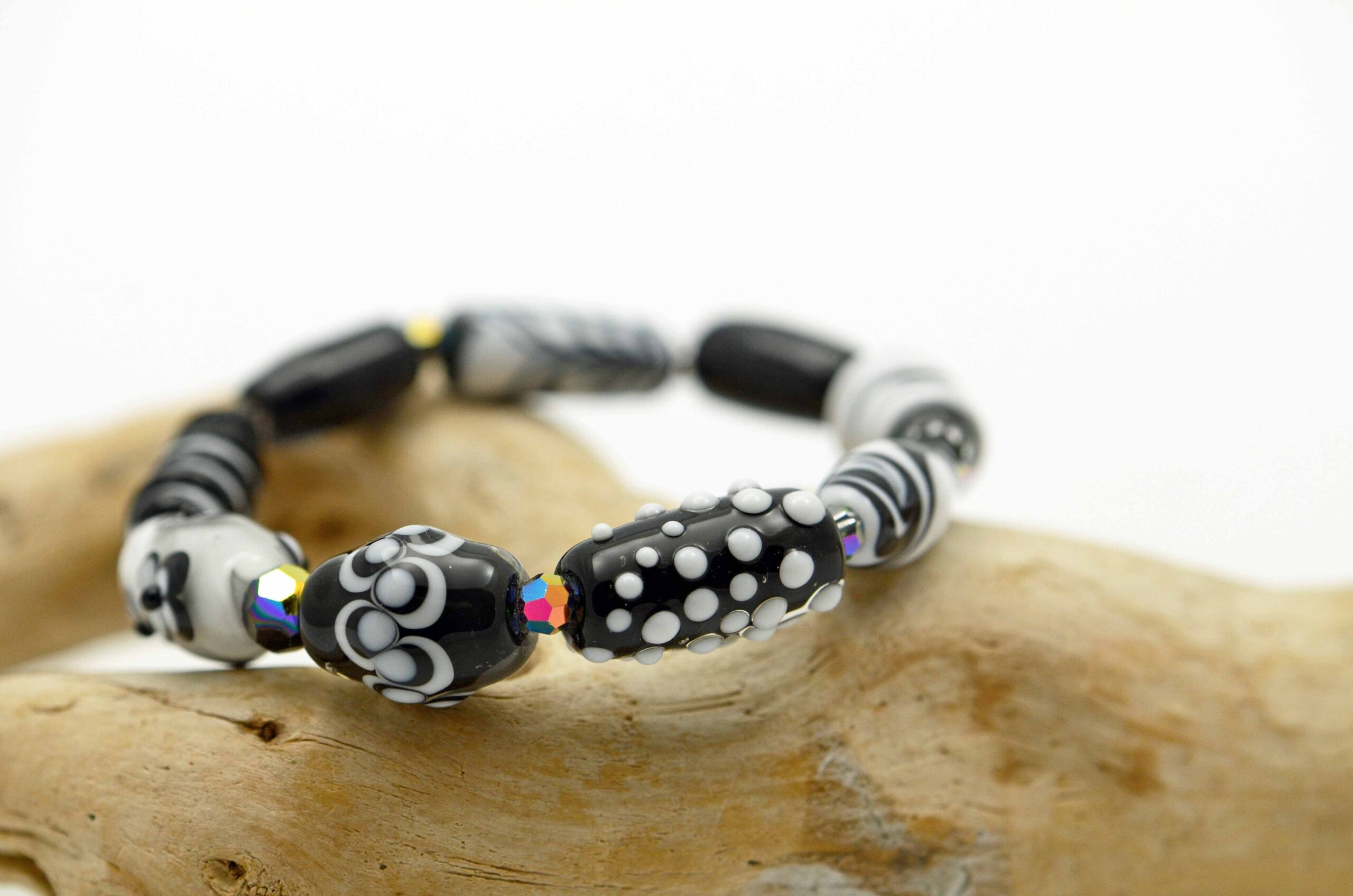 Náramek s devíti ručně vinutými korálky různých tvarů v černobílé barevné kombinaci na gumové pružence. Mezi vinutkami jsou korálky Swarovski.