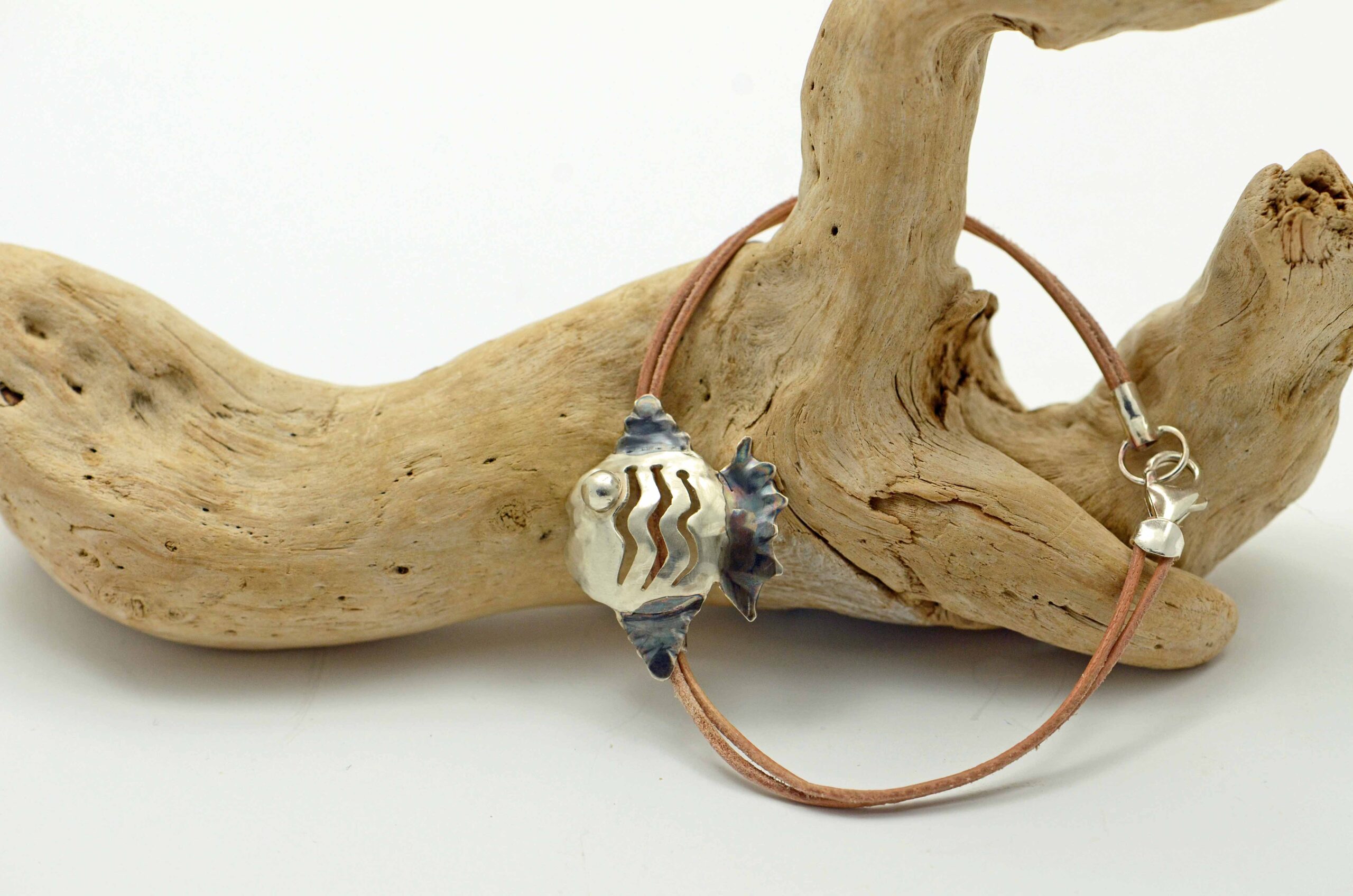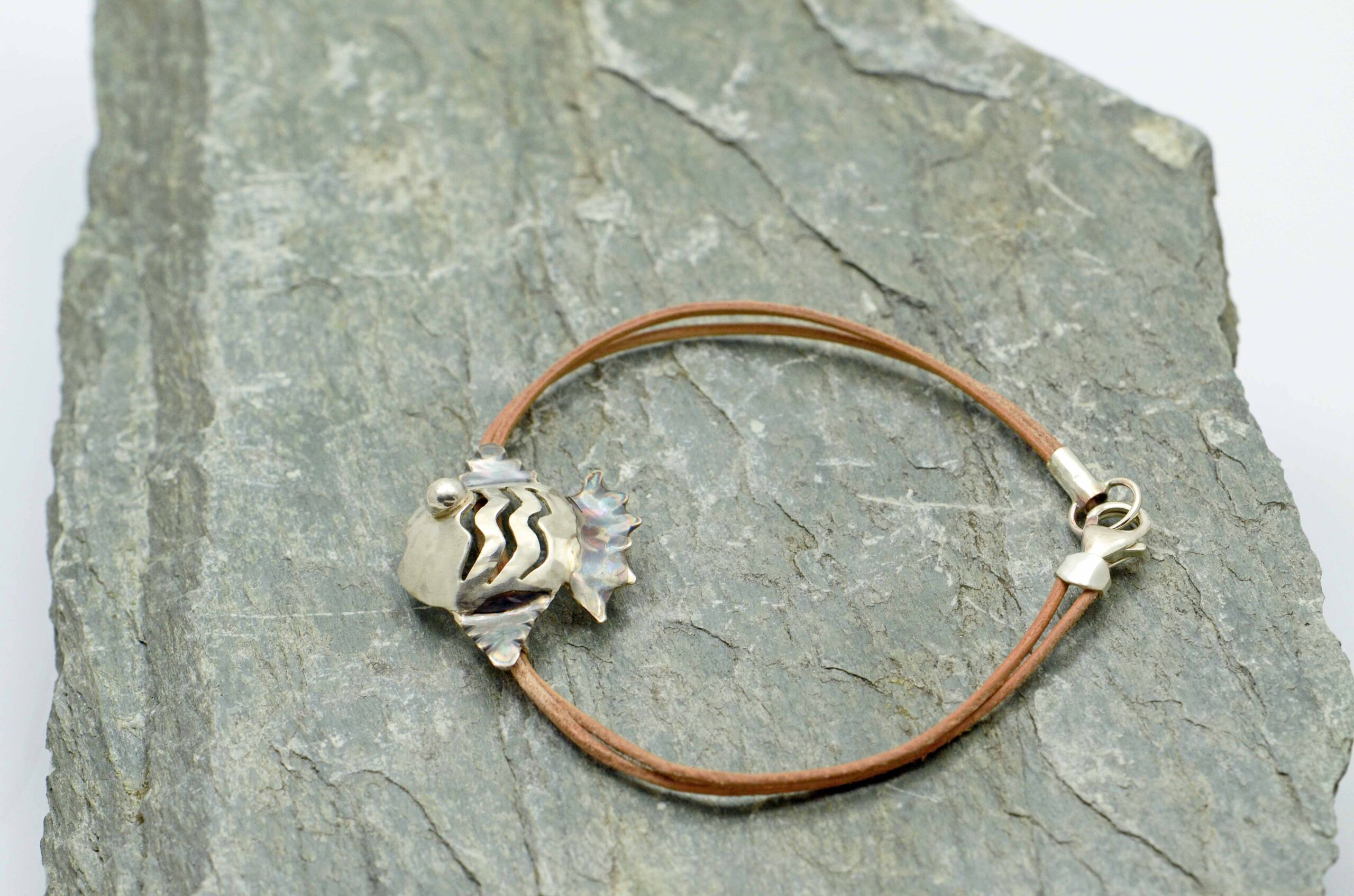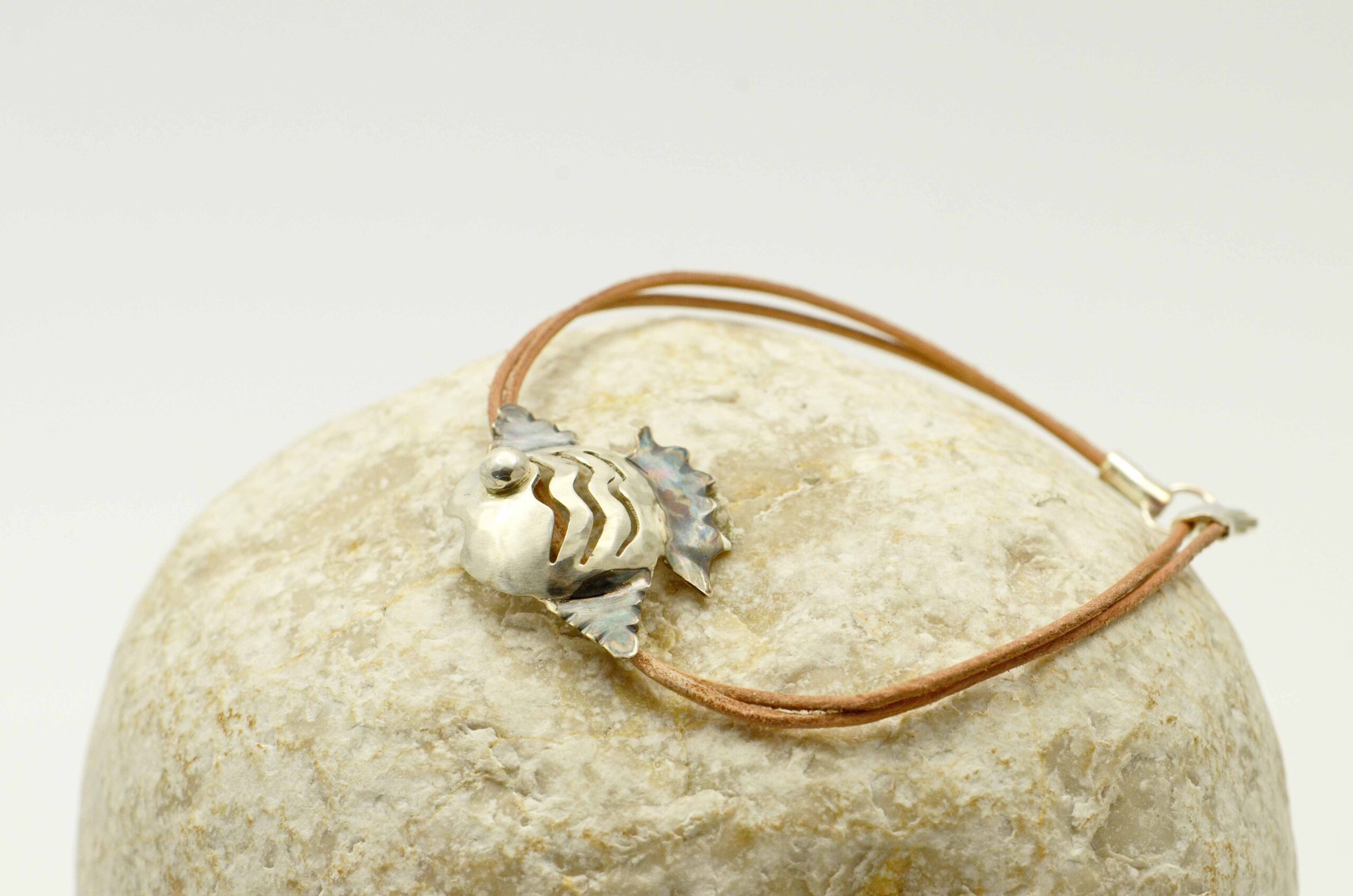 Náramek s ručně dělanou dekorací z Ag 925 ve tvaru rybky na jemném koženém řemínku.