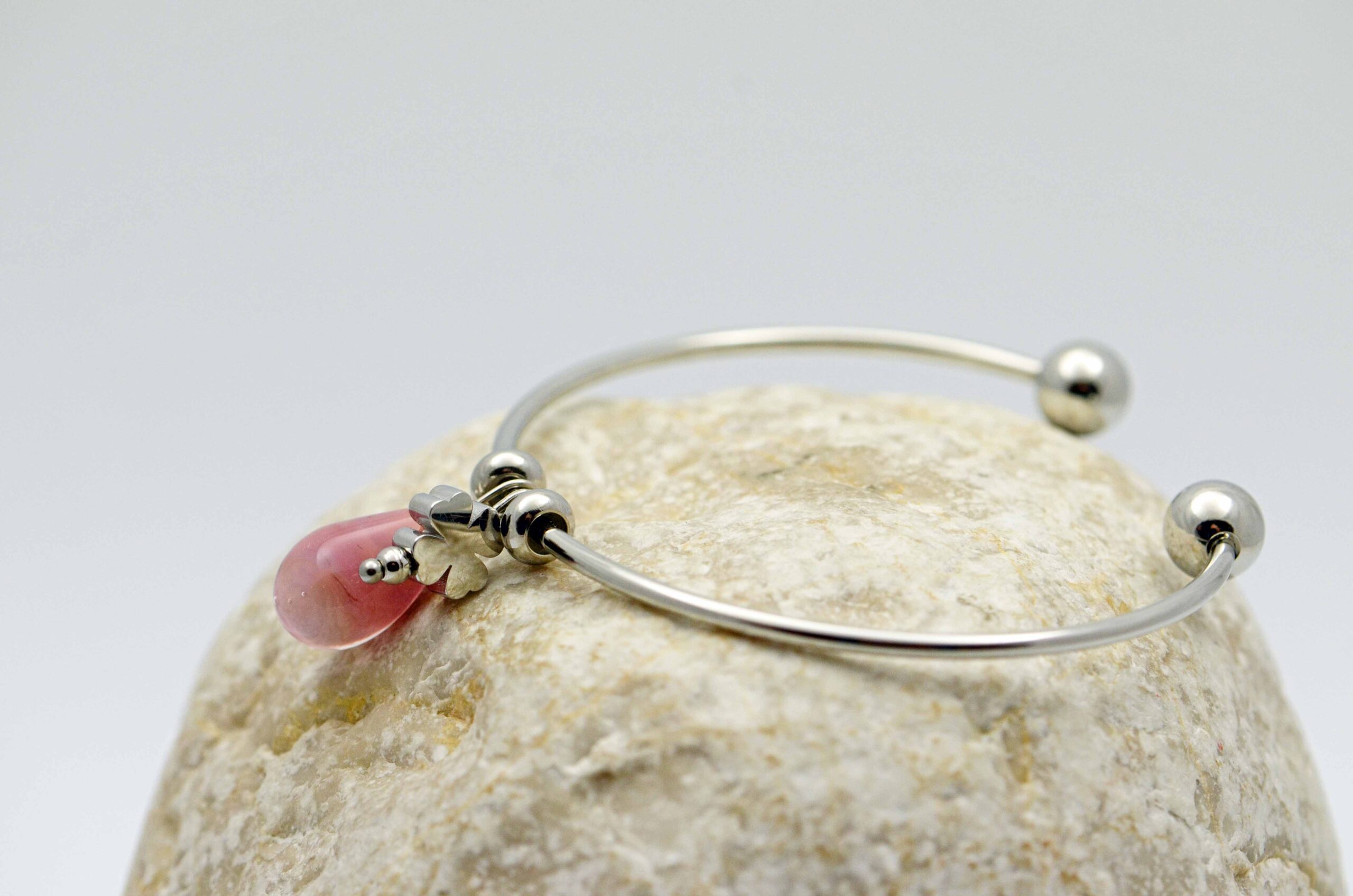 Korálky jsou na pevném náramku z chirugické oceli, z obou stran mají posuvný stoper se silikonovou vložkou a kuličky na zakončeních jsou šroubovací, takže lze korálky přidávat nebo měnit podle potřeby.