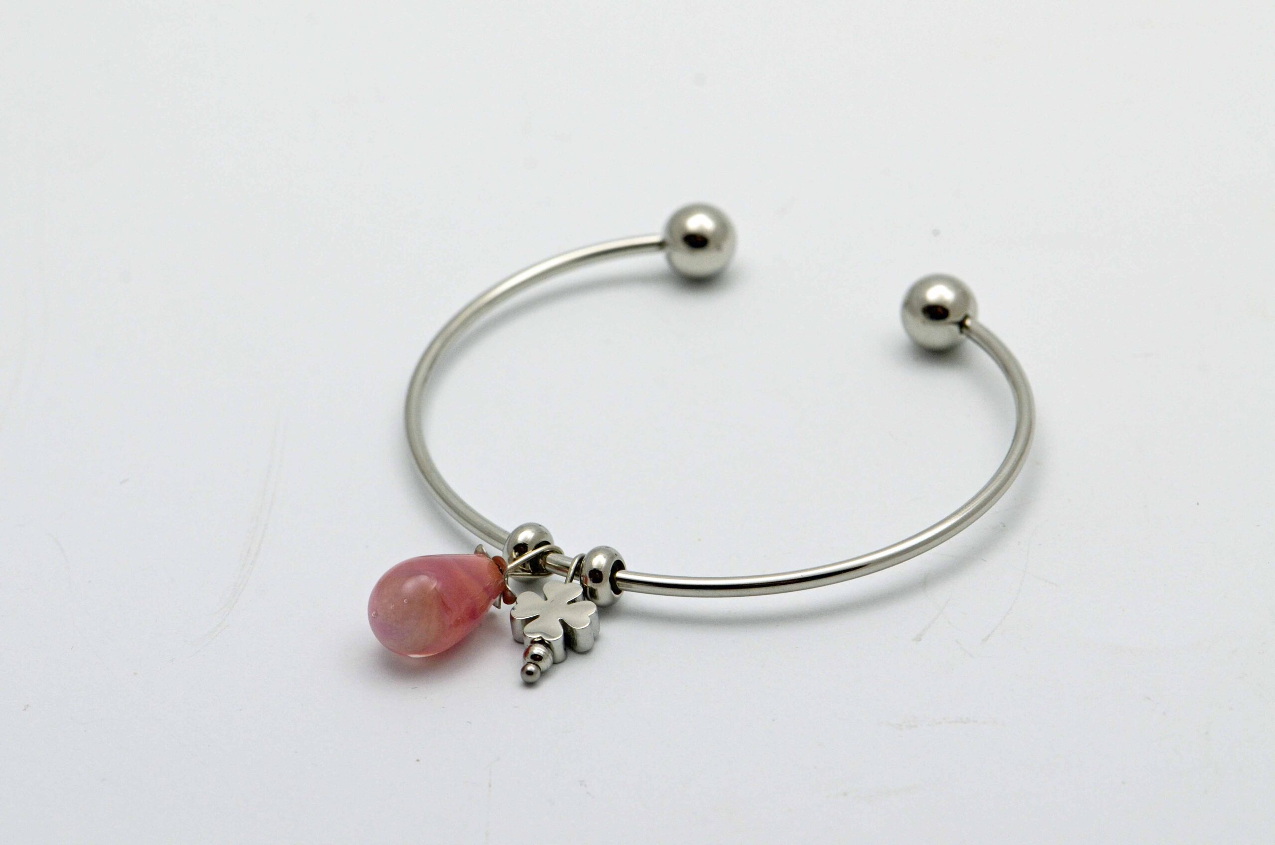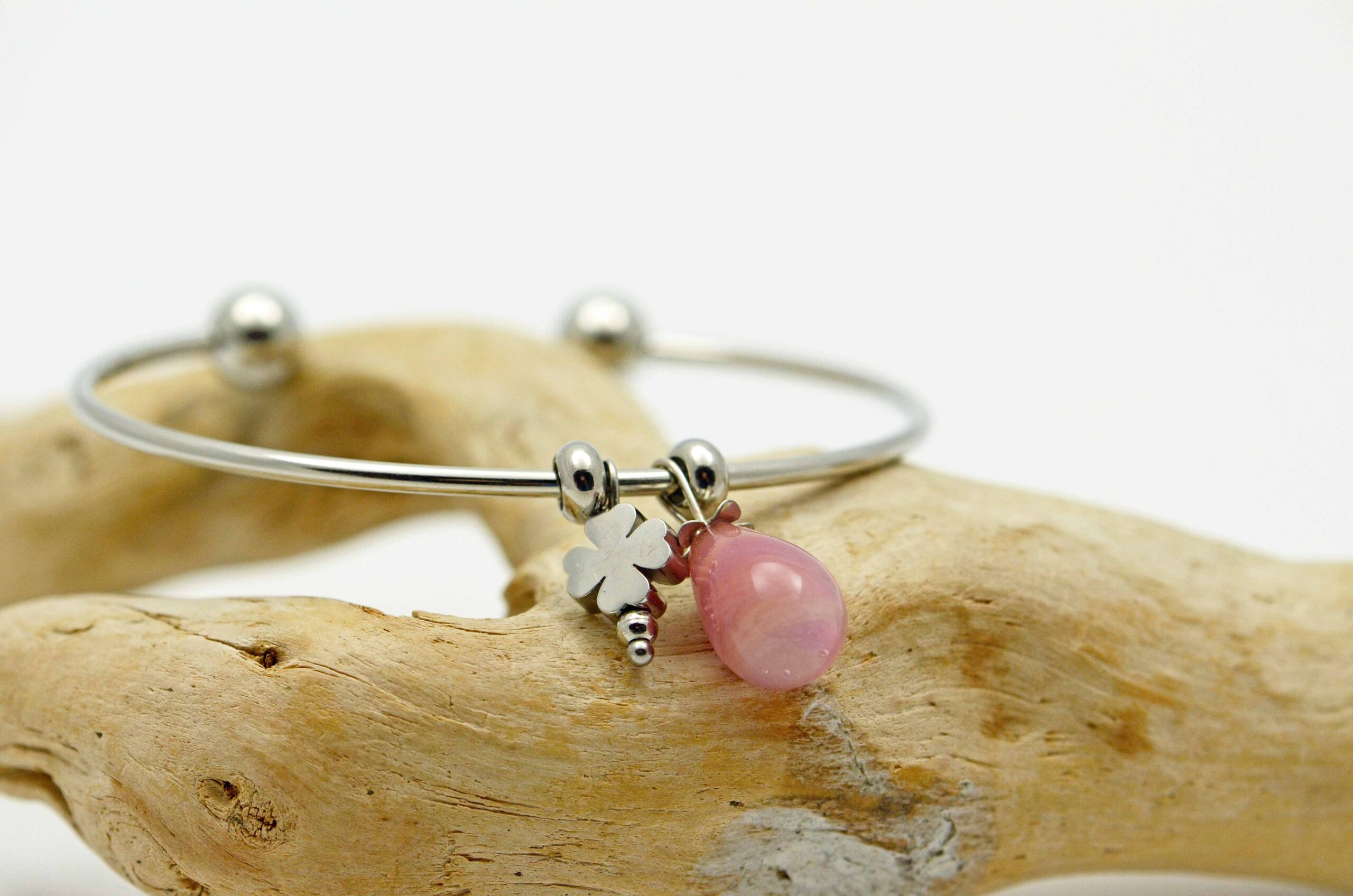 Náramek s ručně vinutou kapkou doplněnou čtyřlístkem z chirurgické oceli.