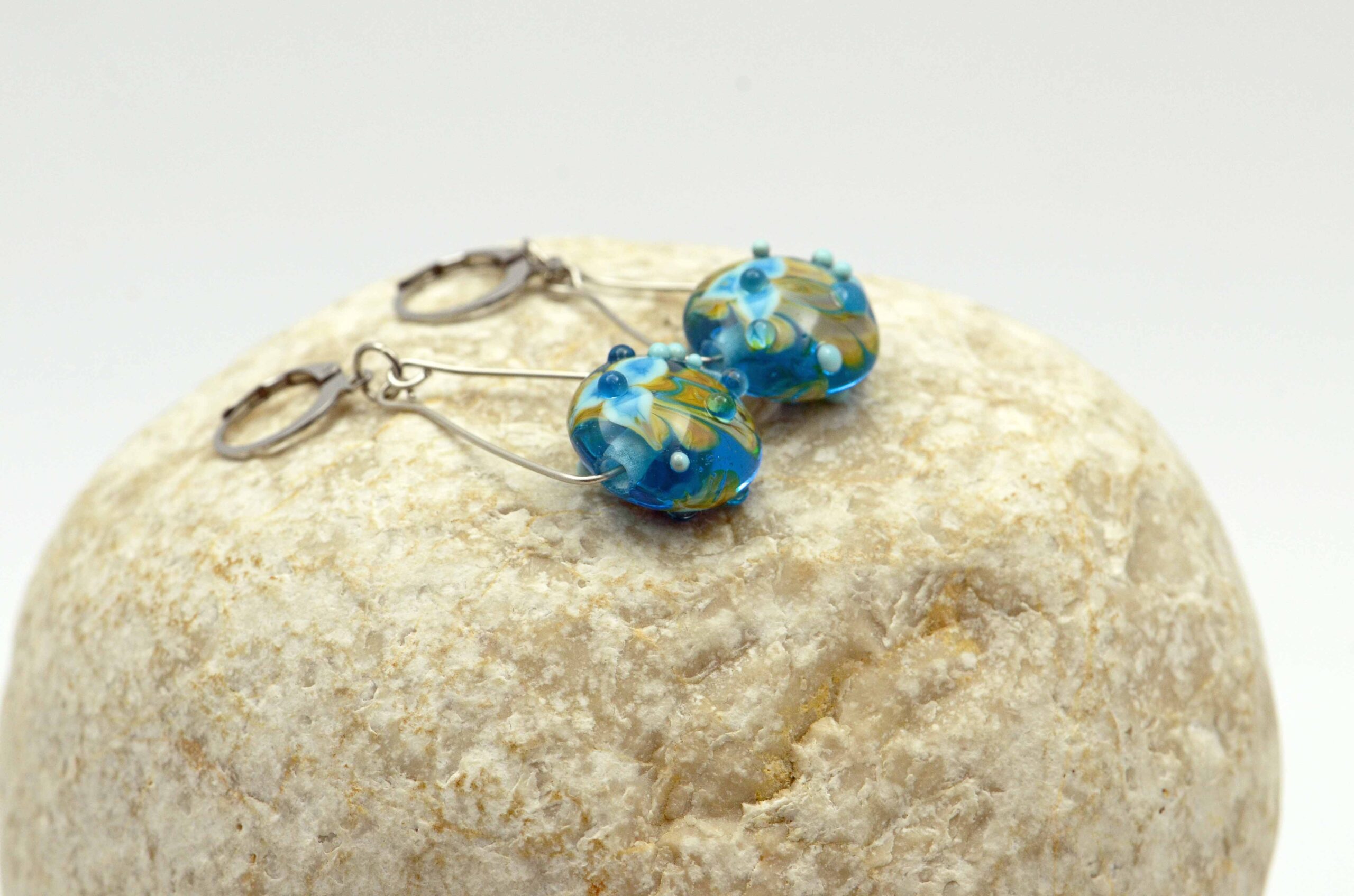 Náušnice s ručně vinutým korálkem ve tvaru čočky na kroužku z chirurgické oceli s klasickým patentním zapínáním.