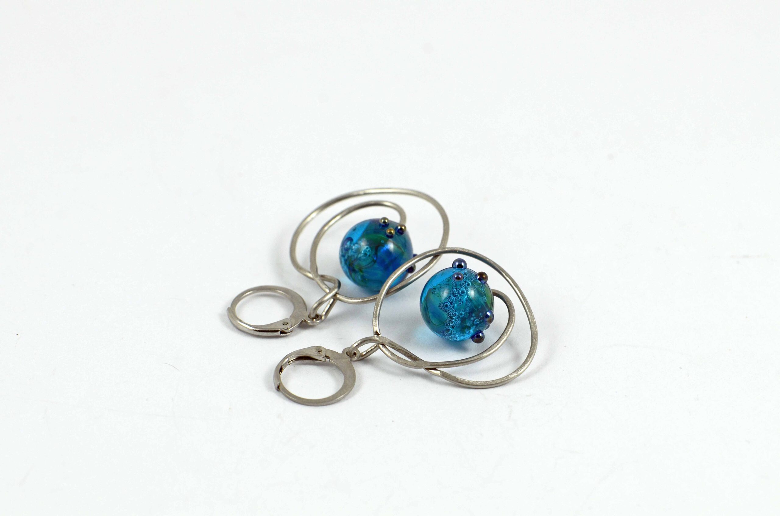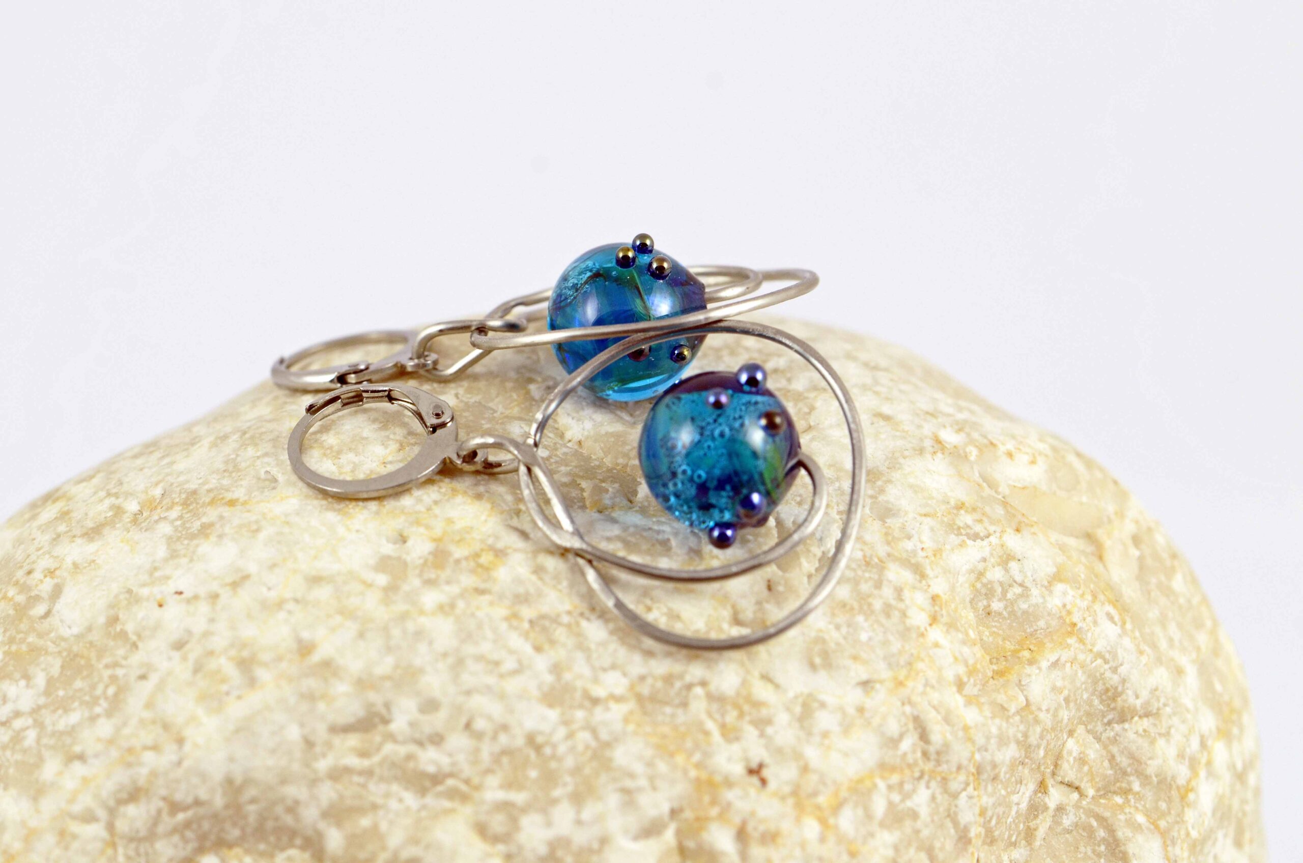 Náušnice s ručně vinutým korálkem, který je zasazený do tepaného a matovaného přívěsku zavěšeného na náušnicovém kroužku s patentním zapínáním.
