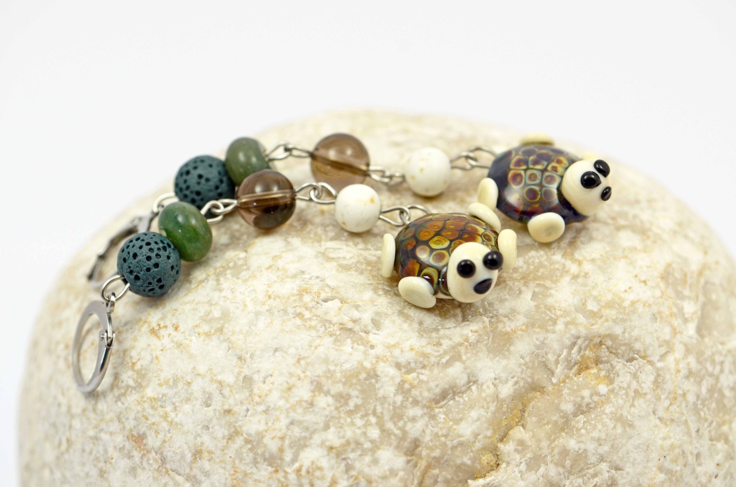 Náušnice s ručně vinutou želvičkou doplněnou o korálky z achátu, howlitu, barvené lávy a záhnědy na kroužku s patentním uzávěrem chirurgické oceli.